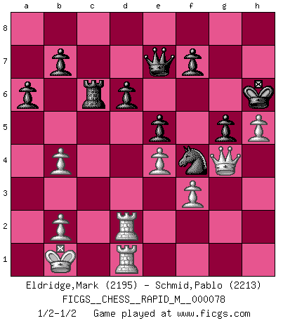 Last move : 1/2-1/2 2015 July 2 16:46:12 [Event "FICGS__CHESS__RAPID_M__000078"] [Site "FICGS"] [Date "2015.03.15"] [Round "1"] [White "Eldridge,Mark"] [Black "Schmid,Pablo"] [Result "1/2-1/2"] [WhiteElo "2195"] [BlackElo "2213"] 1.e4 c5 2.Nf3 d6 3.d4 cxd4 4.Nxd4 Nf6 5.Nc3 g6 6.Be3 Bg7 7.f3 O-O 8.Qd2 Nc6 9.Bc4 Bd7 10.O-O-O Rb8 11.Bb3 Na5 12.Bh6 Bxh6 13.Qxh6 e5 14.Ndb5 Nxb3+ 15.axb3 Bxb5 16.Nxb5 Qa5 17.Na3 Rbd8 18.Qd2 Qa6 19.c4 Qb6 20.Qc3 Rd7 21.Rd2 a6 22.Rhd1 Rc8 23.Kb1 Qd8 24.Qe3 Kg7 25.g4 h5 26.gxh5 Nxh5 27.c5 Rxc5 28.Nc4 R5c7 29.Nb6 Nf4 30.Nxd7 Rxd7 31.Qg1 Qf6 32.Qg4 Qe7 33.h4 Kh6 34.Rh1 Ne6 35.Rg1 Rc7 36.h5 g5 37.Rgd1 Rc6 38.b4 Qd8 39.Rd3 Qe7 40.Qf5 Nf4 41.R3d2 Ne6 42.Qh3 Nf4 43.Qg4 1/2-1/2 Sicilian : Dragon, Yugoslav attack, 7...O-O Kingside Castling by player Black (move 7) Queenside Castling by player White (move 10) This chess game ended in a draw. Follow this game move after move (download)Capture of the adverse King is the ultimate but not the first object of the game. (William Steinitz) Schach sollte überall auf der Welt Schulfach werden. Es fördert die geistige Auseinandersetzung. Es lehrt die Demut in der Niederlage. (Garry Kasparov) En el Ajedrez, cuando menos, el valiente hereda la tierra. (Edmar Mednis) Un journaliste : 'Vous préférez avoir une dame de plus sur l'échiquier ou au lit ?' Boris Spassky : 'Ca dépend de la position.' God is an atheist. (Unknown)