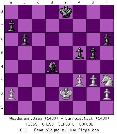 Last move : 0-1 2007 June 5 0:23:21 [Event "FICGS__CHESS__CLASS_E__000036"] [Site "FICGS"] [Date "2007.03.03"] [Round "1"] [White "Weidemann,Jaap"] [Black "Burrows,Nick"] [Result "0-1"] [WhiteElo "1400"] [BlackElo "1400"] 1.c4 Nf6 2.d4 g6 3.Nc3 d5 4.cxd5 Nxd5 5.e4 Nxc3 6.bxc3 Bg7 7.Nf3 O-O 8.Be2 c5 9.Rb1 b6 10.O-O Bb7 11.Qd3 Qc7 12.d5 Nd7 13.Bd2 c4 14.Qxc4 Qxc4 15.Bxc4 Rac8 16.Bb5 Nc5 17.Rfe1 e6 18.Bc4 Ba8 19.Bb3 exd5 20.Bxd5 Rfe8 21.Ng5 Re7 22.f3 Bxd5 23.exd5 Rd7 24.c4 Nd3 25.Re4 h6 26.Nh3 g5 27.Bb4 f5 28.Re7 Rxe7 29.Bxe7 Rxc4 30.d6 Kf7 31.Rd1 Rd4 32.Kf1 Nb4 33.Rc1 Nd5 34.Re1 Rd2 35.g3 Bb2 36.Re2 Rxe2 37.Kxe2 Nxe7 38.dxe7 Bd4 39.e8Q+ Kxe8 0-1 English, 1...Nf6 (Anglo-Indian defense) Kingside Castling by player Black (move 7) Kingside Castling by player White (move 10) Promotion Queen by player White (move 39) Player Black won this chess game. Follow this game move after move (download)Chess, like love, is infectious at any age. (Flohr) Früher wurde jeder komplizierte Zug, jedes interessante Opfer mit großem Beifall und Enthusiasmus aufgenommen. Heute schaltet man einfach seinen Fritz an, und man kann sehen, was los ist, ob der Zug geht oder nicht. (Vladimir Kramnik) El muchacho (en ese entonces un niño de 12 años llamado Anatoly Karpov) no tiene ni idea de lo que es el Ajedrez y no hay futuro en absoluto para el en esta profesión. (Mikhail Botvinnik) Les Echecs sont et restent toujours un combat, un combat intégral comme la boxe, la lutte ou un autre sport, et où il doit y avoir un vainqueur et un vaincu. (Joseph Emil Diemer) Think like a man of action, act like a man of thought. (Henri Louis Bergson)