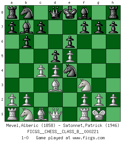 Last move : 1-0 2015 June 4 23:57:58 [Event "FICGS__CHESS__CLASS_B__000221"] [Site "FICGS"] [Date "2015.03.18"] [Round "1"] [White "Mevel,Alberic"] [Black "Satonnet,Patrick"] [Result "1-0"] [WhiteElo "1858"] [BlackElo "1946"] 1.e4 e6 2.d4 b6 3.Nf3 Bb7 4.Bd3 Nf6 5.e5 Ne4 6.O-O d5 7.c4 1-0 This chess game has been lost on time (started : 2015.03.18 18:26:9) French defense Kingside Castling by player White (move 6) Player White won this chess game. Follow this game move after move (download)I have never in my life played the French Defence, which is the dullest of all openings. (Wilhelm Steinitz) Das typische an einem Großmeister ist, daß er eine gewonnene Position schnell und schmerzlos gewinnt. (Irving Chernev) Alekhine es un poeta que crea un trabajo de arte de algo que raramente inspiraría a otra persona a mandar una tarjeta postal. (Max Euwe) La menace est plus forte que l'exécution. (Aaron Nimzovitch) Mandala - that's it! 16x16 squares as multiple of the four and the eight because of the Four Noble Truths and the Noble Eightfold Path. (Heinz-Georg Lehnhoff about Big Chess)