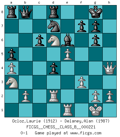 Last move : 0-1 2015 December 15 8:55:47 [Event "FICGS__CHESS__CLASS_B__000221"] [Site "FICGS"] [Date "2015.03.18"] [Round "1"] [White "Ocloz,Laurie"] [Black "Delaney,Alan"] [Result "0-1"] [WhiteElo "1912"] [BlackElo "1987"] 1.e4 d6 2.d4 Nf6 3.Nc3 e5 4.Nf3 Nbd7 5.Bc4 Be7 6.O-O O-O 7.a4 c6 8.Ba2 a5 9.Qe2 exd4 10.Nxd4 Nc5 11.Rd1 Qb6 12.f3 Re8 13.Qf2 Bf8 14.Rb1 Na6 15.Be3 Qd8 16.Rd2 Nb4 17.Bb3 d5 18.Re1 Bc5 19.Nf5 b6 20.Bxc5 bxc5 21.Ne3 d4 22.Nc4 Nbd5 23.Nb1 Nf4 24.c3 Bh3 25.Qh4 Qb8 26.Bc2 Be6 27.Nba3 Nd7 28.cxd4 cxd4 29.e5 Ng6 30.Bxg6 hxg6 31.Nd6 Rd8 0-1 Pirc defense Kingside Castling by player White (move 6) Kingside Castling by player Black (move 6) Player Black won this chess game. Follow this game move after move (download)The chessboard is the world, the pieces are the phenomena of the Universe, the rules of the game are what we call the laws of Nature and the player on the other side is hidden from us. (Thomas Huxley) Sehr viele beherrschen heutzutage das große Einmalseins des Schachspiels und kennen sogar dessen Logarithmentafeln auswendig - deshalb sollte man hin und wieder zu beweisen trachten, dass zwei mal zwei auch fünf sein kann. (Mikhail Nekhemyevich Tal) ¿Quién es tu oponente esta tarde? Esta tarde mi oponente son las piezas negras. (Akiba Rubinstein) Il vaut mieux sacrifier les pièces de l'adversaire. (Xavier Tartacover) Coffee just isn't my cup of tea. (Unknown)