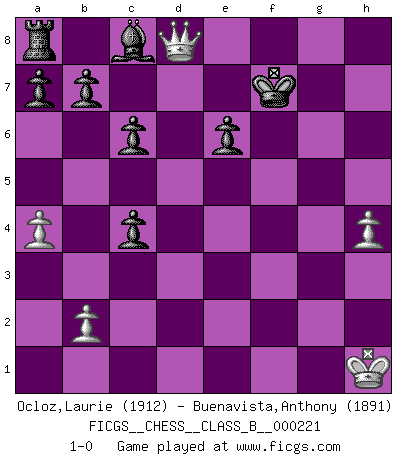 Last move : 1-0 2015 October 6 10:51:26 [Event "FICGS__CHESS__CLASS_B__000221"] [Site "FICGS"] [Date "2015.03.18"] [Round "1"] [White "Ocloz,Laurie"] [Black "Buenavista,Anthony"] [Result "1-0"] [WhiteElo "1912"] [BlackElo "1891"] 1.d4 Nf6 2.c4 e6 3.Nf3 d5 4.g3 Bb4+ 5.Bd2 Be7 6.Bg2 O-O 7.O-O c6 8.Bf4 Nbd7 9.Nc3 dxc4 10.e4 Nh5 11.Be3 Nhf6 12.Bf4 Nh5 13.Bd2 Nhf6 14.a4 e5 15.dxe5 Ng4 16.Bf4 Qa5 17.e6 fxe6 18.Qe2 Nde5 19.Nxe5 Nxe5 20.Bxe5 Qxe5 21.Kh1 g5 22.Rad1 Kh8 23.f4 gxf4 24.gxf4 Rxf4 25.Rxf4 Qxf4 26.e5 Qf5 27.Be4 Qxe5 28.Rf1 Qg5 29.Rf7 Bf6 30.Rxh7+ Kg8 31.Rh3 Kf8 32.Qd1 Be5 33.Bf3 Ke7 34.Rh7+ Bg7 35.Ne4 Qe5 36.Rxg7+ Qxg7 37.Qd6+ Kf7 38.Bh5+ Kg8 39.Qd8+ Kh7 40.Bf7 Qxf7 41.Ng5+ Kg6 42.Nxf7 Kxf7 43.h4 1-0 Queen's pawn game Kingside Castling by player Black (move 6) Kingside Castling by player White (move 7) Player White won this chess game. Follow this game move after move (download)I won't play with you anymore. You have insulted my friend. - When an opponent cursed himself for a blunder. (Miguel Najdorf) Privat ist Kortschnoi kein schlechter Mensch, sehr sympathisch. Aber während des Spiels ist er grausam. Er will dich töten. (Miguel Najdorf) Las piezas de Ajedrez son los bloques del alfabeto que moldean los pensamientos; y esos pensamientos, aunque hagan un diseño visual en el tablero, expresan abstractamente su belleza como un poema. (Marcel Duchamp) Aux échecs, l'amour-propre est satisfait quand on remporte la victoire, mais il n'y a pas de honte à être battu. (Benjamin Franklin) In theory there is no difference between theory and practice. In practice there is. (Yogi Berra)