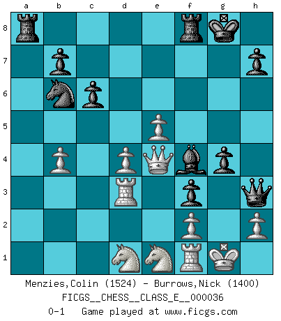 Last move : 0-1 2007 April 4 15:3:26 [Event "FICGS__CHESS__CLASS_E__000036"] [Site "FICGS"] [Date "2007.03.03"] [Round "1"] [White "Menzies,Colin"] [Black "Burrows,Nick"] [Result "0-1"] [WhiteElo "1524"] [BlackElo "1400"] 1.c4 Nf6 2.g3 e5 3.Bg2 d5 4.cxd5 Nxd5 5.Nc3 Nb6 6.d3 Be7 7.Nf3 Nc6 8.O-O Be6 9.a3 O-O 10.Bd2 f5 11.b4 Bf6 12.Rc1 a6 13.Ne1 Nd4 14.e3 Nb3 15.Rb1 Nxd2 16.Qxd2 c6 17.Rd1 Qd7 18.Nf3 a5 19.e4 axb4 20.axb4 f4 21.gxf4 exf4 22.d4 Bh3 23.Bxh3 Qxh3 24.Qe2 g5 25.Rd3 g4 26.e5 Bg7 27.Ne1 f3 28.Qe4 Bh6 29.Nd1 Bf4 0-1 English, 1...Nf6 (Anglo-Indian defense) Kingside Castling by player White (move 8) Kingside Castling by player Black (move 9) Player Black won this chess game. Follow this game move after move (download)In Chess, at least, the brave inherit the earth. (Edmar Mednis) Woher wissen wir, daß der Neanderthaler Blindschach gespielt hat? -- Bei Ausgrabungen wurden keine Schachbretter und Figuren gefunden. (Anonymous) El poder defensivo de una pieza clavada, solamente es imaginario. (Aaron Nimzovich) Les Echecs, c'est l'art de la guerre sans les charniers, c'est la résurrection des morts tombés au champ d'honneur, l'espoir perpétuel, la suprématie de l'intelligence sur la force, la culture de l'esprit. (F. Szpiner) There's no money in correspondence chess. (John Knudsen)