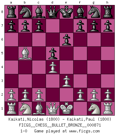 Last move : 1-0 2015 March 19 14:41:53 [Event "FICGS__CHESS__BULLET_BRONZE__000871"] [Site "FICGS"] [Date "2015.03.19"] [Round "1"] [White "Kaikati,Nicolas"] [Black "Kaikati,Paul"] [Result "1-0"] [WhiteElo "1800"] [BlackElo "1800"] 1.d4 d5 2.e3 e6 3.Bb5+ 1-0 Queen's pawn game Player White won this chess game. Follow this game move after move (download)Bobby Fischer is the greatest Chess player who has ever lived. (Ken Smith) Ich würde mich als ganz normalen Jungen bezeichnen [Im Alter von 12]. (Sergej Karjakin) El Ajedrez es un regaderazo frío para la mente. (Sir John Simon) On n'a jamais que l'âge auquel on a commence à jouer aux échecs car après on cesse de vieillir. (Capablanca) Knowledge rests not upon truth alone, but upon error also. (Carl G. Jung)