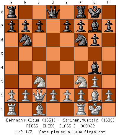Last move : 1/2-1/2 2007 March 20 7:15:48 [Event "FICGS__CHESS__CLASS_C__000032"] [Site "FICGS"] [Date "2007.03.03"] [Round "1"] [White "Behrmann,Klaus"] [Black "Sarihan,Mustafa"] [Result "1/2-1/2"] [WhiteElo "1651"] [BlackElo "1633"] 1.Nf3 Nf6 2.g3 g6 3.Bg2 Bg7 4.O-O d5 5.c4 dxc4 6.Qa4+ Nbd7 7.Qxc4 Nb6 8.Qc2 O-O 9.Nc3 Bg4 1/2-1/2 Reti : King's Indian attack Kingside Castling by player White (move 4) Kingside Castling by player Black (move 8) This chess game ended in a draw. Follow this game move after move (download)Fischer was a master of clarity and a king of artful positioning. His opponents would see where he was going but were powerless to stop him. (Bruce Pandolfini) Bis jetzt ist Weiß einer wohlbekannten Analyse gefolgt. Aber jetzt begeht er einen schrecklichen Fehler: Er beginnt seinen eigenen Kopf zu benutzen. (Siegbert Tarrasch) El Ajedrez es el arte del análisis. (Mikhail Botvinnik) On n'a jamais que l'âge auquel on a commence à jouer aux échecs car après on cesse de vieillir. (Capablanca) I think your argument is specious - I think your tie is ugly. (Gregory House to Dr. Foreman, House M.D.)