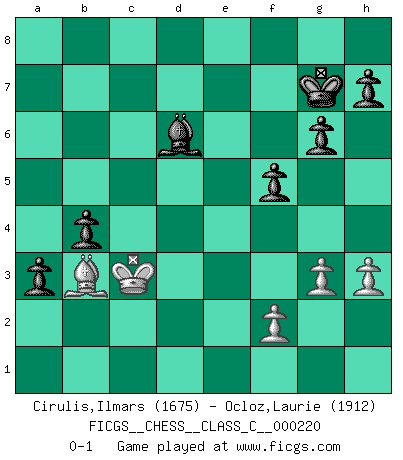 Last move : 0-1 2015 April 24 18:41:42 [Event "FICGS__CHESS__CLASS_C__000220"] [Site "FICGS"] [Date "2015.03.20"] [Round "1"] [White "Cirulis,Ilmars"] [Black "Ocloz,Laurie"] [Result "0-1"] [WhiteElo "1675"] [BlackElo "1912"] 1.b4 Nf6 2.a3 d5 3.e3 g6 4.Bb2 Bg7 5.Be2 a5 6.b5 O-O 7.Nf3 Bg4 8.O-O c6 9.c4 Nbd7 10.cxd5 cxd5 11.h3 Bxf3 12.Bxf3 Nb6 13.a4 Qc7 14.Nc3 Rfc8 15.Rc1 Qd6 16.Rc2 e6 17.Qb1 Nc4 18.Rfc1 Nxb2 19.Qxb2 Nd7 20.d4 Nb6 21.Ne2 Rxc2 22.Qxc2 Bf8 23.Qd1 Qb4 24.e4 e5 25.exd5 exd4 26.Qxd4 Nxa4 27.Rc4 Qb1+ 28.Nc1 Rd8 29.Kh2 Nb2 30.Be4 Qa1 31.Nb3 Qa3 32.Rc2 Qxb3 33.Rxb2 Qa3 34.g3 Bg7 35.Qb6 Rd6 36.Rb3 Rxb6 37.Rxa3 Rxb5 38.d6 Kf8 39.Re3 Bd4 40.Re2 Re5 41.Kg2 f5 42.Bd3 Rxe2 43.Bxe2 a4 44.Kf3 a3 45.Bc4 Be5 46.Ke3 Bxd6 47.Kd3 b5 48.Bb3 Kg7 49.Kc3 b4+ 0-1 Polish (Sokolsky) opening Kingside Castling by player Black (move 6) Kingside Castling by player White (move 8) Player Black won this chess game. Follow this game move after move (download)If I win a tournament, I win it by myself. I do the playing. Nobody helps me. (Bobby Fischer) Ich würde die 30 stärksten Spieler der USA im Simultanspiel besiegen. (José Raúl Capablanca) Un mal plan es mejor que no tener ningún plan. (Frank Marshall) Il vaut mieux sacrifier les pièces de l'adversaire. (Xavier Tartacover) It's only after you lost everything, Tyler says, that you're free to do anything. (Chuck Palahniuk, Fight Club)