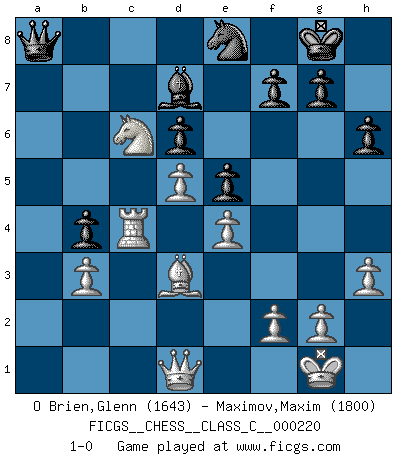 Last move : 1-0 2015 September 6 0:4:23 [Event "FICGS__CHESS__CLASS_C__000220"] [Site "FICGS"] [Date "2015.03.20"] [Round "1"] [White "O Brien,Glenn"] [Black "Maximov,Maxim"] [Result "1-0"] [WhiteElo "1643"] [BlackElo "1800"] 1.e4 e5 2.Nf3 Nc6 3.Bb5 a6 4.Ba4 Nf6 5.O-O Be7 6.Re1 O-O 7.c3 d6 8.h3 b5 9.Bb3 Bb7 10.d4 Na5 11.Bc2 Nd7 12.Nbd2 c5 13.Nf1 Qc7 14.d5 Nc4 15.Ng3 Bc8 16.a4 Ncb6 17.Nf5 Nf6 18.a5 Nc4 19.Nxe7+ Qxe7 20.b3 Nxa5 21.Rxa5 Qc7 22.Ra2 a5 23.Qe2 Ba6 24.Nh4 b4 25.Bd3 Bc8 26.cxb4 cxb4 27.Bg5 Ne8 28.Rc1 Qb8 29.Be7 Bd7 30.Bxf8 Kxf8 31.Rc4 Nf6 32.Nf3 h6 33.Qd1 Ne8 34.Nd4 Kg8 35.Nc6 Qb7 36.Rxa5 Rxa5 37.Nxa5 Qa8 38.Nc6 1-0 Ruy Lopez : Closed defense Kingside Castling by player White (move 5) Kingside Castling by player Black (move 6) Player White won this chess game. Follow this game move after move (download)Chess is no whit inferior to the violin, and we have a large number of professional violinists. (Mikhail Botvinnik) Schach verlangt totale Konzentration. (Robert James Fischer) Siempre es mejor sacrificar los hombres de tu oponente. (Savielly Tartakower) Le thème de l'attaque double intervient d'une manière ou d'une autre dans l'immense majorité des combinaisons. (Youri Averbakh) A good aphorism is too hard for the tooth of time, and is not worn away with the centuries, although it serves as food for every speech. (Friedrich Nietzsche)