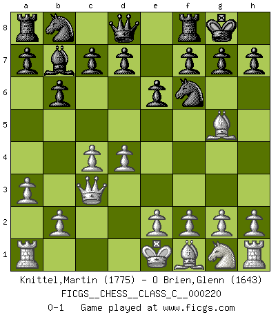 Last move : 0-1 2015 May 3 9:9:38 [Event "FICGS__CHESS__CLASS_C__000220"] [Site "FICGS"] [Date "2015.03.20"] [Round "1"] [White "Knittel,Martin"] [Black "O Brien,Glenn"] [Result "0-1"] [WhiteElo "1775"] [BlackElo "1643"] 1.d4 Nf6 2.c4 e6 3.Nc3 Bb4 4.Qc2 O-O 5.a3 Bxc3+ 6.Qxc3 b6 7.Bg5 Bb7 0-1 This chess game has been lost on time (started : 2015.03.20 23:7:50) Nimzo-Indian : Classical variation Kingside Castling by player Black (move 4) Player Black won this chess game. Follow this game move after move (download)Some part of a mistake is always correct. (Savielly Tartakover) Die westlichen Werte sind eine Sprache, welche die Putin-Administration nicht versteht. (Garry Kasparov) Todos los jugadores de Ajedrez deberían tener un pasatiempo. (Savielly Tartakower) 'L'échange des dames est un coup dur pour les deux adversaires...' Un journaliste lors d'une partie du match Spassky-Fischer To steal ideas from one person is plagiarism. To steal from many is research. (Unknown)