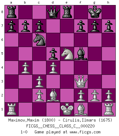 Last move : 1-0 2015 May 5 8:53:13 [Event "FICGS__CHESS__CLASS_C__000220"] [Site "FICGS"] [Date "2015.03.20"] [Round "1"] [White "Maximov,Maxim"] [Black "Cirulis,Ilmars"] [Result "1-0"] [WhiteElo "1800"] [BlackElo "1675"] 1.e4 e5 2.Nf3 Nf6 3.Nxe5 d6 4.Nf3 Nxe4 5.d4 d5 6.Qd3 Nc6 7.Nc3 Bb4 8.Bd2 O-O 9.a3 Bf5 10.Qe3 Nxc3 11.bxc3 Re8 12.Ne5 Be6 13.axb4 Bf5 14.Qf3 1-0 Petrov : Classical attack Kingside Castling by player Black (move 8) Player White won this chess game. Follow this game move after move (download)The Chess pieces are the block alphabet which shapes thoughts; and these thoughts, although making a visual design on the chessboard, express their beauty abstractly, like a poem. (Marcel Duchamp) Privat ist Kortschnoi kein schlechter Mensch, sehr sympathisch. Aber während des Spiels ist er grausam. Er will dich töten. (Miguel Najdorf) El tablero es el mundo, las piezas es el fenomeno del universo, las reglas del juego son lo que llamamos leyes de la naturaleza y el jugador del lado opuesto, se encuentra oculto a nuestra vista. (Thomas Huxley) Les échecs, c'est la lutte contre l'erreur. (Johannes Zukertort) Chess, like love, like music, has the power to make people happy. (Siegbert Tarrasch)