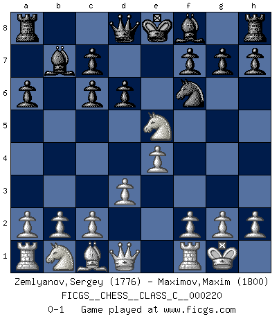 Last move : 0-1 2015 May 21 10:44:40 [Event "FICGS__CHESS__CLASS_C__000220"] [Site "FICGS"] [Date "2015.03.20"] [Round "1"] [White "Zemlyanov,Sergey"] [Black "Maximov,Maxim"] [Result "0-1"] [WhiteElo "1776"] [BlackElo "1800"] 1.e4 e5 2.Nf3 Nc6 3.Bb5 Nf6 4.d3 a6 5.Bxc6 bxc6 6.Nxe5 Bb7 7.O-O d6 0-1 This chess game has been lost on time (started : 2015.03.20 23:7:50) Ruy Lopez : Berlin defense Kingside Castling by player White (move 7) Player Black won this chess game. Follow this game move after move (download)There is no remorse like the remorse of Chess. (H. G. Wells) Das Blackmar-Diemer-Gambit verändert den ganzen Menschen! (Emil Joseph Diemer) No solamente yo pronostico su triunfo sobre Botvinnik, sino que me adelanto y digo que probablemente Fischer es el jugador de Ajedrez mas grande que haya existido. (John Collins) Pour moi, les échecs ne sont pas un jeu mais un art. (Alexandre Alekhine) Wisdom doesn't necessarily come with age. Sometimes age just shows up all by itself. (Tom Wilson)