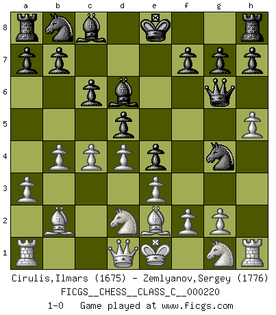 Last move : 1-0 2015 May 8 9:38:33 [Event "FICGS__CHESS__CLASS_C__000220"] [Site "FICGS"] [Date "2015.03.20"] [Round "1"] [White "Cirulis,Ilmars"] [Black "Zemlyanov,Sergey"] [Result "1-0"] [WhiteElo "1675"] [BlackElo "1776"] 1.b4 d5 2.a3 e5 3.Bb2 Bd6 4.e3 Nf6 5.c4 c6 6.d4 e4 7.Nd2 Ng4 8.Be2 Qg5 9.h4 Qg6 10.h5 1-0 This chess game has been lost on time (started : 2015.03.20 23:7:50) Polish (Sokolsky) opening Player White won this chess game. Follow this game move after move (download)The winner of the game is the player who makes the next-to-last mistake. (Savielly Tartakover) Ich verachte die Medien. (Robert James Fischer) Un mal plan es mejor que no tener ningún plan. (Frank Marshall) Toutes choses étant égales, c'est la conviction qui gagne. Alliée à une volonté de vaincre, elle sert de détonateur, suscite des idées, disperse les doutes et aide à penser clairement. (Robert Fischer) Good luck. You're gonna need it. (Han Solo in Star Wars ep.6)