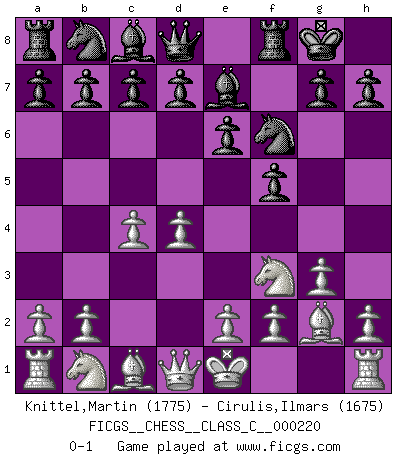 Last move : 0-1 2015 May 3 21:9:31 [Event "FICGS__CHESS__CLASS_C__000220"] [Site "FICGS"] [Date "2015.03.20"] [Round "1"] [White "Knittel,Martin"] [Black "Cirulis,Ilmars"] [Result "0-1"] [WhiteElo "1775"] [BlackElo "1675"] 1.d4 f5 2.c4 Nf6 3.g3 e6 4.Bg2 Be7 5.Nf3 O-O 0-1 This chess game has been lost on time (started : 2015.03.20 23:7:50) Dutch defense Kingside Castling by player Black (move 5) Player Black won this chess game. Follow this game move after move (download)He who takes the Queen's Knight's Pawn will sleep in the streets. (Anonymous) Ich könnte leicht behaupten: Ja,ja, Leonid Breschnew wollte nicht, daß ich Weltmeister werde. In der Tat war die Sache komplizierter. (Viktor Kortschnoi) Tu no necesitas jugar muy bien, únicamente ayudar a tu oponenet a que juegue muy mal. (Genrikh Chepukaitis) Mais l'homme est une créature légère et illogique : semblable au joueur d'échecs, il n'aime que le processus du but à atteindre, non le but lui-même. (Dostoïevsky) He who defends everything defends nothing. (Frederick the Great)