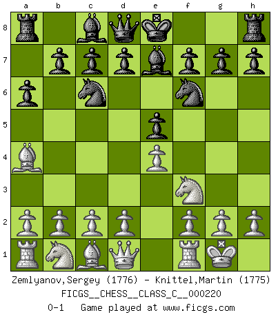Last move : 0-1 2015 May 22 22:45:5 [Event "FICGS__CHESS__CLASS_C__000220"] [Site "FICGS"] [Date "2015.03.20"] [Round "1"] [White "Zemlyanov,Sergey"] [Black "Knittel,Martin"] [Result "0-1"] [WhiteElo "1776"] [BlackElo "1775"] 1.e4 e5 2.Nf3 Nc6 3.Bb5 a6 4.Ba4 Nf6 5.O-O Be7 0-1 This chess game has been lost on time (started : 2015.03.20 23:7:50) Ruy Lopez : Closed defense Kingside Castling by player White (move 5) Player Black won this chess game. Follow this game move after move (download)Robert Fischer is a law unto himself. (Larry Evans) Immer nach dem besten Zug zu suchen ist ziemlich unpraktisch. (Nigel Short) Un buen sacrificio es aquel que aunque no sea necesariamente sólido, deja a tu oponente aturdido y confuso. (Rudolph Spielmann) Karpov est une pièce de musée. (Garry Kasparov) Have no fear of perfection - you'll never reach it. (Salvador Dali)