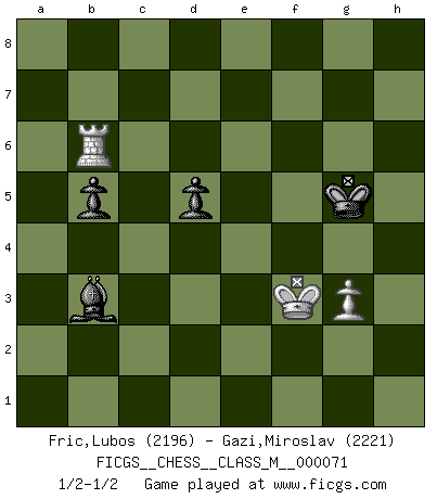Last move : 1/2-1/2 2016 March 6 18:34:48 [Event "FICGS__CHESS__CLASS_M__000071"] [Site "FICGS"] [Date "2015.03.21"] [Round "1"] [White "Fric,Lubos"] [Black "Gazi,Miroslav"] [Result "1/2-1/2"] [WhiteElo "2196"] [BlackElo "2221"] 1.d4 f5 2.g3 Nf6 3.c4 g6 4.Nc3 Bg7 5.Bg2 O-O 6.Nf3 d6 7.O-O c6 8.Rb1 a5 9.Qb3 Na6 10.Rd1 h6 11.Ne1 Rb8 12.c5 Kh7 13.Nd3 Bd7 14.a3 b5 15.Qc2 Qe8 16.b4 axb4 17.axb4 Be6 18.cxd6 exd6 19.e4 fxe4 20.Nxe4 Nxe4 21.Bxe4 Nc7 22.Bxc6 Qf7 23.Be4 Nd5 24.Nf4 Nxf4 25.Bxf4 Rbc8 26.Qe2 Bc4 27.Qe3 d5 28.Bc2 Rce8 29.Qc3 Qf6 30.h4 h5 31.Qf3 Kg8 32.Re1 Qb6 33.Rxe8 Rxe8 34.Be3 Bxd4 35.Bxd4 Qxd4 36.Bxg6 Rf8 37.Rd1 Qb6 38.Qxh5 Qxf2+ 39.Kh1 Kg7 40.Ra1 Qf3+ 41.Qxf3 Rxf3 42.Kg2 Rb3 43.Ra6 Rxb4 44.Rd6 Rb3 45.h5 Kh6 46.Bc2 Kxh5 47.Bxb3 Bxb3 48.Kf3 Kg5 49.Rb6 1/2-1/2 Dutch defense Kingside Castling by player Black (move 5) Kingside Castling by player White (move 7) 10 pieces endgame at move 43 : White KRBPP , Black KRBPP WHITE : King + 1 Rook 1 Bishop 2 Pawns BLACK : King + 1 Rook 1 Bishop 2 Pawns 9 pieces endgame at move 46 : White KRBP , Black KRBPP WHITE : King + 1 Rook 1 Bishop 1 Pawn BLACK : King + 1 Rook 1 Bishop 2 Pawns 8 pieces endgame at move 47 : White KRBP , Black KBPP WHITE : King + 1 Rook 1 Bishop 1 Pawn BLACK : King + 1 Bishop 2 Pawns 7 pieces endgame at move 47 : White KRP , Black KBPP WHITE : King + 1 Rook 1 Pawn BLACK : King + 1 Bishop 2 Pawns This chess game ended in a draw. Follow this game move after move (download)The passed Pawn is a criminal, who should be kept under lock and key. Mild measures, such as police surveillance, are not sufficient. (Aaron Nimzovich) Pläne sind die Träume des Verständigen. (Ernst Freiherr von Feuchtersleben) Yo creo que el Ajedrez posee una magia que es también una ayuda en la edad avanzada. Una rodilla reumática es olvidada durante una partida de Ajedrez y otros eventos pueden parecer algo sin importancia comparada a una catástrofe en el tablero de Ajedrez. (Vlastimil Hort) A ce moment-là, je menaçais de comprendre la position ! (Clément L'Heureux) Who needs drugs and alcohol if he can play Big Chess at FICGS ? (Heinz-Georg Lehnhoff)
