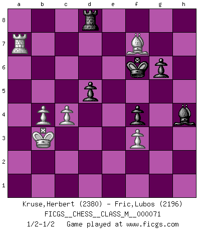Last move : 1/2-1/2 2015 August 21 20:55:28 [Event "FICGS__CHESS__CLASS_M__000071"] [Site "FICGS"] [Date "2015.03.21"] [Round "1"] [White "Kruse,Herbert"] [Black "Fric,Lubos"] [Result "1/2-1/2"] [WhiteElo "2380"] [BlackElo "2196"] 1.e4 c5 2.Nf3 d6 3.d4 cxd4 4.Nxd4 Nf6 5.Nc3 a6 6.f3 e5 7.Nb3 Be6 8.Be3 Be7 9.Qd2 O-O 10.O-O-O Nbd7 11.g4 b5 12.a3 Qc7 13.g5 Nh5 14.Nd5 Bxd5 15.exd5 Nb6 16.Na5 Nxd5 17.Qxd5 Qxa5 18.Bd3 g6 19.Be4 Rab8 20.Kb1 Qc7 21.Qd2 b4 22.axb4 Rb5 23.Bd3 R5b8 24.Qc3 Qb7 25.Be4 Qb5 26.Rd5 Qxb4 27.Qxb4 Rxb4 28.c3 Rb5 29.Kc2 Nf4 30.Bxf4 exf4 31.h4 Rfb8 32.b4 Rc8 33.Kb3 Kg7 34.Rxb5 axb5 35.Ra1 Bd8 36.Bd3 h6 37.Bxb5 hxg5 38.hxg5 Bxg5 39.Ra7 d5 40.Bd7 Rd8 41.Be6 Kf6 42.Bxf7 Bh4 43.c4 1/2-1/2 Sicilian : Najdorf Kingside Castling by player Black (move 9) Queenside Castling by player White (move 10) This chess game ended in a draw. Follow this game move after move (download)The stomach is an essential part of the Chess master. (Bent Larsen) Eine Person mit durchschnittlichem IQ kann etwa eine ELO von 2000 erreichen. (Jonathan Levitt) En el Ajedrez, tal como es jugado por los Maestros, practicamente la suerte es eliminada. (Emanuel Lasker) Il n'y a pas eu de défaite parce que je ne crois pas que cet ordinateur ait jamais existé. IBM a triché en refusant d'imprimer les modes de recherche de la machine. C'est évident, pendant le match, des coups décisifs ont été joués par des êtres humains. Aujourd'hui, les meilleurs spécialistes en informatique ne peuvent toujours pas expliquer comment Deep-Blue a pu jouer contre la logique des ordinateurs. IBM a gagné une guerre de communication, mais ils sont incapables de prouver que l'ordinateur a gagné tout seul. (Garry Kasparov) At last I discovered the true beauty of chess. So I proposed to her. (Dinesh De Silva)