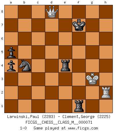 Last move : 1-0 2016 March 16 6:32:0 [Event "FICGS__CHESS__CLASS_M__000071"] [Site "FICGS"] [Date "2015.03.21"] [Round "1"] [White "Larwinski,Paul"] [Black "Clement,George"] [Result "1-0"] [WhiteElo "2283"] [BlackElo "2225"] 1.d4 d5 2.c4 c6 3.Nf3 Nf6 4.Nc3 dxc4 5.a4 Bf5 6.e3 e6 7.Bxc4 Bb4 8.O-O O-O 9.Nh4 Bg6 10.Nxg6 hxg6 11.Qb3 Qb6 12.Bd2 Nbd7 13.Rfd1 a5 14.Rac1 Rad8 15.Nb1 Bxd2 16.Nxd2 Qc7 17.Nf3 Nb6 18.Be2 Nbd5 19.Ne5 Nb4 20.g3 Ra8 21.Nc4 Nd7 22.e4 Nb6 23.Ne5 Rfe8 24.Bf3 Nd7 25.Nc4 Red8 26.Qe3 Nb6 27.b3 Nxc4 28.bxc4 Qe7 29.h4 Rd7 30.Rd2 Rad8 31.e5 f5 32.Bg2 Qf7 33.f4 Qf8 34.Bf3 Qf7 35.Rcd1 Qe8 36.Kg2 Rc7 37.Qe2 Rcd7 38.h5 gxh5 39.Bxh5 g6 40.Bf3 g5 41.Bh5 Qe7 42.g4 Qh7 43.gxf5 Qxf5 44.Qg4 Rg7 45.Qxf5 exf5 46.Kg3 gxf4+ 47.Kf3 b5 48.cxb5 cxb5 49.d5 Rg5 50.d6 Rxh5 51.e6 Rh3+ 52.Kxf4 Kg7 53.e7 Rdh8 54.d7 R3h4+ 55.Ke5 Re4+ 56.Kxf5 Rxe7 57.Rg1+ Kf7 58.Rh1 Rxh1 59.d8Q bxa4 60.Rf2 Rg1 61.Rh2 Rf1+ 62.Kg4 Re4+ 63.Kg3 1-0 This chess game has been lost on time (started : 2015.03.21 16:14:59) QGD Slav : Dutch variation Kingside Castling by player White (move 8) Kingside Castling by player Black (move 8) 10 pieces endgame at move 58 : White KRPP , Black KRRNPP WHITE : King + 1 Rook 2 Pawns BLACK : King + 2 Rooks 1 Knight 2 Pawns Promotion Queen by player White (move 59) 9 pieces endgame at move 59 : White KQR , Black KRRNPP WHITE : King + 1 Queen 1 Rook BLACK : King + 2 Rooks 1 Knight 2 Pawns Player White won this chess game. Follow this game move after move (download)The King is a fighting piece. Use it ! (Wilhelm Steinitz) Der Knackpunkt bei der Konzentration ist, daß wir nur durch sie etwas Neues und Ungewöhnliches am Schachbrett finden können. Sie ist der einzige Weg durch neue neue Ideen eine Überraschung zu bereiten. (Garry Kasparov) El tablero es el mundo, las piezas es el fenomeno del universo, las reglas del juego son lo que llamamos leyes de la naturaleza y el jugador del lado opuesto, se encuentra oculto a nuestra vista. (Thomas Huxley) Seul un grand joueur sait à quel point il joue faiblement. (Xavier Tartacover) Life doesn't imitate art, it imitates bad television. (Woody Allen)