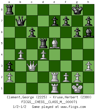 Last move : 1/2-1/2 2015 July 31 22:58:37 [Event "FICGS__CHESS__CLASS_M__000071"] [Site "FICGS"] [Date "2015.03.21"] [Round "1"] [White "Clement,George"] [Black "Kruse,Herbert"] [Result "1/2-1/2"] [WhiteElo "2225"] [BlackElo "2380"] 1.e4 c5 2.Nf3 Nc6 3.Bb5 g6 4.O-O Bg7 5.Nc3 d6 6.e5 dxe5 7.Bxc6+ bxc6 8.Re1 Qc7 9.d3 c4 10.h3 Be6 11.Qe2 cxd3 12.cxd3 Nf6 13.Nxe5 O-O 14.Bf4 Qb7 15.d4 Rfd8 16.Rad1 a5 17.Nd3 Bc4 18.b3 Bb5 19.Qe3 Bxd3 20.Qxd3 Nd5 21.Be5 Nxc3 22.Qxc3 Bh6 23.Re2 Rd5 24.Rde1 a4 25.b4 a3 1/2-1/2 Sicilian : Nimzovich-Rossolimo attack (with ...g6, without ...d6) Kingside Castling by player White (move 4) Kingside Castling by player Black (move 13) This chess game ended in a draw. Follow this game move after move (download)The enormous mental resilience, without which no Chess player can exist, was so much taken up by Chess that he could never free his mind of this game. (Albert Einstein) Ein Gewinn durch eine ungenaue Kombination, sei sie auch noch so vorzeigbar, erfüllt mich mit Schaudern. (Wilhelm Steinitz) El jugador blanco perdió porque fallo en recordar la coreccta continuación y tuvo que pensar por sí mismo las movidas. (Siegbert Tarrasch) Celui qui prend des risques peut perdre, celui qui n'en prend pas perd toujours. (Xavier Tartacover) There are three kinds of lies: lies, damned lies and statistics. (Mark Twain)