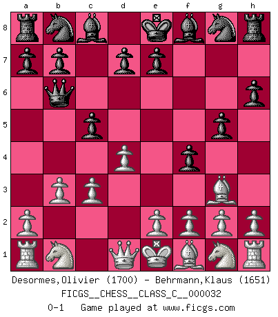 Last move : 0-1 2007 April 26 18:50:50 [Event "FICGS__CHESS__CLASS_C__000032"] [Site "FICGS"] [Date "2007.03.03"] [Round "1"] [White "Desormes,Olivier"] [Black "Behrmann,Klaus"] [Result "0-1"] [WhiteElo "1700"] [BlackElo "1651"] 1.d4 f5 2.Bg5 h6 3.Bh4 c5 4.c3 g5 5.Bg3 Qb6 6.b3 f4 0-1 This chess game has been lost on time (started : 2007.03.03 12:43:54) Dutch, 2.Bg5 variation Player Black won this chess game. Follow this game move after move (download)Chess is a more highly symbolic game, but the aggressions are therefore even more frankly represented in the play. It probably began as a war game; that is, the representation of a miniature battle between the forces of two kingdoms. (Karl Meninger) Dieses schreckliche Gefühl, dass ich gegen eine Maschine spielte, die niemals Fehler macht, zerschmetterte meinen Widerstand. (Mark Taimanov) Yo considero que Fischer es uno de los expertos mas grandes de aperturas de siempre. (Keith Hayward) Je menace de comprendre la position. (Anonyme) Perhaps the current trend of many chess professionals taking up the more lucrative pastime of poker is not a wholly negative one. It may not be too late for humans to relearn how to take risks in order to innovate and thereby maintain the advanced lifestyles we enjoy. And if it takes a poker-playing supercomputer to remind us that we can't enjoy the rewards without taking the risks, so be it. (The Chess Master and the Computer, by Garry Kasparov - 2010)