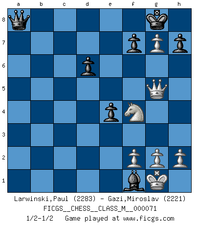 Last move : 1/2-1/2 2015 July 16 22:27:49 [Event "FICGS__CHESS__CLASS_M__000071"] [Site "FICGS"] [Date "2015.03.21"] [Round "1"] [White "Larwinski,Paul"] [Black "Gazi,Miroslav"] [Result "1/2-1/2"] [WhiteElo "2283"] [BlackElo "2221"] 1.e4 c5 2.Nf3 Nc6 3.d4 cxd4 4.Nxd4 Nf6 5.Nc3 e5 6.Ndb5 d6 7.Bg5 a6 8.Na3 b5 9.Bxf6 gxf6 10.Nd5 f5 11.Bd3 Be6 12.c3 Bg7 13.Qh5 O-O 14.exf5 Bxd5 15.f6 e4 16.fxg7 Re8 17.Be2 Re5 18.Qh6 Rg5 19.O-O Ne5 20.Nc2 Nd3 21.Nd4 Nxb2 22.a4 Nxa4 23.c4 Bb7 24.cxb5 Nc3 25.bxa6 Nxe2+ 26.Nxe2 Bxa6 27.Nf4 Bxf1 28.Rxa8 Qxa8 29.Qxg5 1/2-1/2 Sicilian : Pelikan (Lasker/Sveshnikov) variation Kingside Castling by player Black (move 13) Kingside Castling by player White (move 19) This chess game ended in a draw. Follow this game move after move (download)The King is a fighting piece. Use it ! (Wilhelm Steinitz) Karpov ist ein Museumsstück. (Garry Kasparov) Cuando me preguntan: -¿Cual es el secreto que te hace hacer mejores movidas que tus oponentes?, Yo respondo: Me da gusto que me pregunten eso, porque, como veran, hay una simple razón. Yo pienso mis propias movidas y dejo a mi oponente que el piense las suyas. (Alexander Alekhine) Les sacrifices démontrent seulement que quelqu'un a gaffé. (Savielly Tartacover) Those who make the worst use of their time are the first to complain of its brevity. (Jean de la Bruyere)