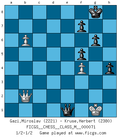 Last move : 1/2-1/2 2016 March 4 17:51:10 [Event "FICGS__CHESS__CLASS_M__000071"] [Site "FICGS"] [Date "2015.03.21"] [Round "1"] [White "Gazi,Miroslav"] [Black "Kruse,Herbert"] [Result "1/2-1/2"] [WhiteElo "2221"] [BlackElo "2380"] 1.d4 Nf6 2.Bg5 c5 3.d5 Ne4 4.Bf4 e6 5.f3 Bd6 6.Bxd6 Nxd6 7.e4 b5 8.Nc3 b4 9.Na4 Qc7 10.c3 bxc3 11.Nxc3 O-O 12.Nh3 Na6 13.Qd2 Rb8 14.dxe6 dxe6 15.Rd1 Rb6 16.Be2 c4 17.O-O Nc5 18.e5 Nf5 19.Bxc4 Qxe5 20.Rfe1 Qc7 21.Nf2 Rd6 22.Qe2 Qb6 23.Nb5 R6d8 24.b4 Nd7 25.a3 Nf6 26.Nc3 Bd7 27.Bd3 Rc8 28.Qb2 h6 29.Rc1 Rfd8 30.Kh1 Bc6 31.Bxf5 exf5 32.Nh3 Rc7 33.Nf4 Rcd7 34.Qc2 g6 35.Rcd1 a5 36.Rxd7 Rxd7 37.Na2 Rd4 38.Nd3 Bd5 39.Nc3 Bc4 40.Ne5 axb4 41.Qb2 Kh7 42.axb4 Be6 43.Nb5 Rd8 44.Nc3 Nd5 45.Nxd5 Rxd5 46.h3 Qc7 47.Qa1 Rd2 48.Qc1 Rc2 49.Qe3 Qd6 50.Nd3 Bc4 51.Rd1 h5 52.Qe5 Qd8 53.Qc5 Bb3 54.Qe3 Rxg2 55.Kxg2 Bxd1 56.b5 Bb3 57.Ne5 Be6 58.b6 h4 59.f4 Qa8+ 60.Kf2 Qa2+ 61.Ke1 Qb1+ 62.Kf2 Qb2+ 63.Ke1 Qb4+ 64.Ke2 Ba2 65.Nf3 Bc4+ 66.Kf2 Qb2+ 67.Ke1 Bb5 68.Kd1 Kg8 69.Ke1 Bc6 70.Qd4 Qc1+ 71.Kf2 Bxf3 72.Kxf3 Qf1+ 73.Qf2 Qxh3+ 74.Ke2 Qb3 75.Kf1 Qd5 76.Kg1 Qe4 77.Qb2 Qe1+ 1/2-1/2 Trompowsky attack (Ruth, Opovcensky Opening) Kingside Castling by player Black (move 11) Kingside Castling by player White (move 17) 10 pieces endgame at move 73 : White KQPP , Black KQPPPP WHITE : King + 1 Queen 2 Pawns BLACK : King + 1 Queen 4 Pawns This chess game ended in a draw. Follow this game move after move (download)It is always better to sacrifice your opponent's men. (Savielly Tartakower) Meine Liebe ist Schach, Schach, Schach. Ich muss jeden Tag Schach spielen, deshalb fühle ich mich so stark. (Miguel Najdorf) Debemos de asegurarnos de que el Ajedrez no se convierta en un lenguaje muerto, muy interesante, pero solo para un grupo muy pequeño. (Sytze Faber) Votre prénom est 'Tactique', votre deuxième prénom est 'Tactique' et votre nom est 'Tactique'. (Ken Smith) You can think I'm wrong, but that's no reason to quit thinking. (Gregory House, House M.D.)
