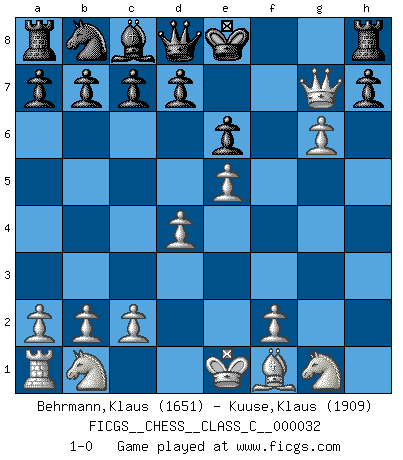 Last move : 1-0 2007 April 9 8:16:40 [Event "FICGS__CHESS__CLASS_C__000032"] [Site "FICGS"] [Date "2007.03.03"] [Round "1"] [White "Behrmann,Klaus"] [Black "Kuuse,Klaus"] [Result "1-0"] [WhiteElo "1651"] [BlackElo "1909"] 1.d4 f5 2.h3 Nf6 3.g4 fxg4 4.hxg4 g6 5.g5 Nh5 6.e4 e6 7.Rxh5 gxh5 8.Qxh5+ Ke7 9.g6 Bg7 10.Bg5+ Bf6 11.e5 Bxg5 12.Qxg5+ Ke8 13.Qh5 Kf8 14.Qh6+ Ke8 15.Qg7 1-0 Dutch, Korchnoi attack Player White won this chess game. Follow this game move after move (download)When I asked Fischer why he had not played a certain move in our game, he replied: 'Well, you laughed when I wrote it down !' (Mikhail Tal) Wer sich die Fähigkeit anerziehen will im Schach selbstständig zu denken, der muß alles meiden, was leblos ist: ausgeklügelte Theorien, die sich auf sehr wenige Beispiele und eine Menge Hirngespinste stützen. (Emanuel Lasker) No existe un remordimiento como el remordimiento del Ajedrez. (H. G. Wells) La menace est plus forte que l'exécution. (Aaron Nimzovitch) Macintosh - we might not get everything right, but at least we knew the century was going to end. (Douglas Adams)