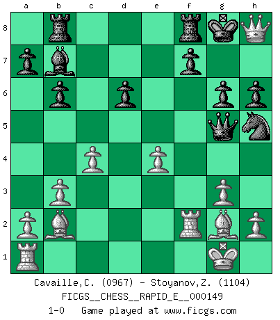 Last move : 1-0 2015 April 15 20:49:21 [Event "FICGS__CHESS__RAPID_E__000149"] [Site "FICGS"] [Date "2015.03.22"] [Round "1"] [White "Cavaille,Cedric"] [Black "Stoyanov,Zdravko"] [Result "1-0"] [WhiteElo "0967"] [BlackElo "1104"] 1.c4 c5 2.Nc3 Nc6 3.Nf3 d6 4.d4 cxd4 5.Nxd4 Nxd4 6.Qxd4 h6 7.g3 b6 8.Bg2 Rb8 9.b3 e5 10.Qd3 Qf6 11.Nd5 Qd8 12.Nb4 Be7 13.Nd5 Nf6 14.Nxe7 Qxe7 15.O-O O-O 16.e4 Bb7 17.f4 exf4 18.Rxf4 Nh5 19.Rf5 g6 20.Rf2 Qe5 21.Bb2 Qc5 22.Qc3 Qg5 23.Qh8+ 1-0 English : Symmetrical variation Kingside Castling by player White (move 15) Kingside Castling by player Black (move 15) Player White won this chess game. Follow this game move after move (download)For surely of all the drugs in the world, Chess must be the most permanently pleasurable. (Assiac) Die westlichen Werte sind eine Sprache, welche die Putin-Administration nicht versteht. (Garry Kasparov) El jugador táctico sabe que hacer cuando hay algo que hacer; mientras que el estratega sabe que hacer cuando no hay nada que hacer. (Gerald Abrahams) Les erreurs sont comme les malheurs, elles n'arrivent jamais seules. (Siegbert Tarrasch) Political correctness is subjecting us to gross incompetence. (Johann Piek)