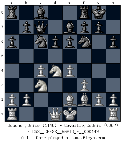 Last move : 0-1 2015 May 19 10:37:5 [Event "FICGS__CHESS__RAPID_E__000149"] [Site "FICGS"] [Date "2015.03.22"] [Round "1"] [White "Boucher,Brice"] [Black "Cavaille,Cedric"] [Result "0-1"] [WhiteElo "1148"] [BlackElo "0967"] 1.e4 c5 2.Nf3 d6 3.d4 cxd4 4.Nxd4 Nf6 5.f3 e6 6.c4 Nc6 7.Nc3 a6 8.Bg5 h6 9.Bh4 Be7 10.Be2 O-O 11.Bf2 Qc7 0-1 This chess game has been lost on time (started : 2015.03.22 14:20:32) Sicilian : Prins (Moscow) variation Kingside Castling by player Black (move 10) Player Black won this chess game. Follow this game move after move (download)I won't play with you anymore. You have insulted my friend. - When an opponent cursed himself for a blunder. (Miguel Najdorf) Es tut gut, die Entwicklungsperiode von, [...] demokratischem Geist durchdringen zu lassen. Wie undemokratisch wäre es doch beispielsweise, den einen Offizier große Spaziertouren vornehmen zu lassen, während die anderen zu Hause säßen und sich entsetzlich langweilten. (Aaron Nimzowitsch) La estratégia requiere pensar, la táctica requiere observación. (Max Euwe) Même si vous avez un bon coup à faire, regardez toujours s'il n'y en a pas un qui lui soit préférable. (Pedro Damiano) History is the quarrels of popes and kings, with wars or pestilences in every page; the men all so good for nothing, and hardly any women at all. (Jane Austen)