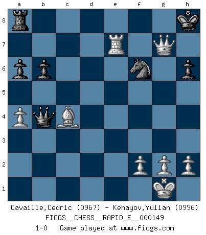 Last move : 1-0 2015 June 2 15:14:22 [Event "FICGS__CHESS__RAPID_E__000149"] [Site "FICGS"] [Date "2015.03.22"] [Round "1"] [White "Cavaille,Cedric"] [Black "Kehayov,Yulian"] [Result "1-0"] [WhiteElo "0967"] [BlackElo "0996"] 1.c4 e5 2.Nc3 c5 3.Nf3 d6 4.e3 Nf6 5.d4 cxd4 6.exd4 exd4 7.Nxd4 Be7 8.Bd3 O-O 9.O-O h6 10.Re1 d5 11.cxd5 Re8 12.Bc4 a6 13.a4 b6 14.Qf3 Bd6 15.Rxe8+ Qxe8 16.Bf4 Bxf4 17.Qxf4 Nbd7 18.Nf5 Nc5 19.d6 Qd8 20.Re1 Bxf5 21.Qxf5 Qxd6 22.b4 Ncd7 23.Ne4 Nxe4 24.Qxf7+ Kh8 25.Rxe4 Nf6 26.Re7 Qxb4 27.Qxg7+ 1-0 English Opening Kingside Castling by player Black (move 8) Kingside Castling by player White (move 9) Player White won this chess game. Follow this game move after move (download)For me, Chess is life and every game is like a new life. Every Chess player gets to live many lives in one lifetime. (Eduard Gufeld) Spielt Blackmar-Diemer-Gambit, und das Matt kommt von selbst! (Emil Joseph Diemer) Evita las multitudes. Haz independientemente tu propio razonamiento. Trata de ser el jugador de Ajedrez, no la pieza de Ajedrez. (Ralph Charell) Les écrivains ont utilisé les échecs pour analyser les côtés extrêmes de la nature humaine. Dans ce cadre, les échecs offrent un champ d'expérimentation idéal. Mais on pourrait faire la même chose avec la peinture. Et là, en vous référant à Van Gogh, vous ne tirerez pas de conclusion définitive sur les peintres. (Gary Kasparov) Your best chance to get a Royal Flush in a casino is in the bathroom. (Anonymous)