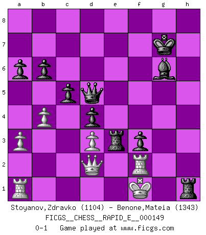 Last move : 0-1 2015 April 18 9:3:49 [Event "FICGS__CHESS__RAPID_E__000149"] [Site "FICGS"] [Date "2015.03.22"] [Round "1"] [White "Stoyanov,Zdravko"] [Black "Benone,Mateia"] [Result "0-1"] [WhiteElo "1104"] [BlackElo "1343"] 1.e4 e5 2.Nf3 Nf6 3.d3 Nc6 4.a3 d5 5.exd5 Nxd5 6.h3 Bd6 7.Be2 O-O 8.O-O Bf5 9.c4 Nf6 10.Bg5 h6 11.Bh4 g5 12.Bg3 Re8 13.Nc3 Nd4 14.Nxd4 exd4 15.Nb5 Be5 16.Bxe5 Rxe5 17.g4 Bg6 18.f4 gxf4 19.Rxf4 c5 20.g5 hxg5 21.Rf2 a6 22.Nc7 Rc8 23.Nd5 Nxd5 24.cxd5 Qxd5 25.Bf3 Qd7 26.Bg4 f5 27.Bh5 Kg7 28.Bf3 Rh8 29.Kg2 Re3 30.b4 b6 31.Qd2 g4 32.hxg4 fxg4 33.Be2 Qd5+ 34.Bf3 gxf3+ 35.Kf1 Rh1+ 0-1 Petrov's defense Kingside Castling by player Black (move 7) Kingside Castling by player White (move 8) Player Black won this chess game. Follow this game move after move (download)Chess is a forcing house where the fruits of character can ripen more fully than in life. (Edward Morgan Foster) Du weisst es gibt ein Problem mit Computern und Fernschach, wenn jeder eine Rating von 2450 hat. (John Christen Knudsen) Es muy difícil jugar en contra de la teoría de Einstein. - en su primera derrota en contra de Fischer (Mikhail Tal) Assurément je connaissais par expérience le mystérieux attrait de ce jeu royal, le seul entre tous les jeux inventés par les hommes qui échappe souverainement à la tyrannie du hasard, le seul où l'on ne doive sa victoire qu'à son intelligence ou plutôt à une certaine forme d'intelligence. Mais n'est-ce pas déjà le limiter injurieusement que d'appeler les échecs un jeu ? N'est-ce pas une science, un art ou quelque chose qui, comme le cercueil de Mahomet entre ciel et terre, est suspendu entre l'un et l'autre, et qui réunit un nombre incroyable de contraires ? [...] C'est une pensée qui ne mène à rien, une mathématique qui n'établit rien, un art qui ne laisse pas d'uvre, une architecture sans matière; et il l'a prouvé néanmoins qu'il était plus durable, à sa manière, que les livres ou que tout autre monument, ce jeu unique qui appartient à tous les peuples et à tous les temps, et dont personne ne sait quel dieu en fit don à la terre pour tuer l'ennui, pour aiguiser l'esprit et stimuler l'âme. Où commence-t-il, où finit-il ? (Stefan Zweig) Knowledge rests not upon truth alone, but upon error also. (Carl G. Jung)