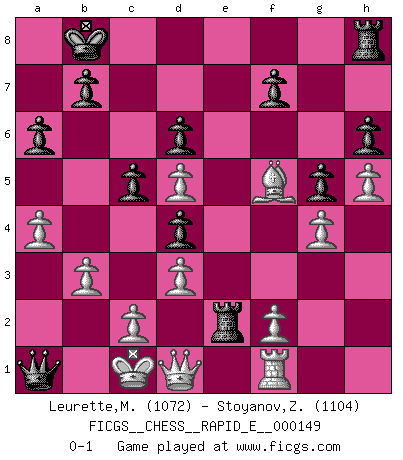 Last move : 0-1 2015 April 15 21:11:7 [Event "FICGS__CHESS__RAPID_E__000149"] [Site "FICGS"] [Date "2015.03.22"] [Round "1"] [White "Leurette,Marc-Antoine"] [Black "Stoyanov,Zdravko"] [Result "0-1"] [WhiteElo "1072"] [BlackElo "1104"] 1.e4 c5 2.Nc3 a6 3.g3 Nc6 4.Bg2 e5 5.d3 h6 6.Be3 d6 7.Qd2 Nf6 8.Nge2 Ng4 9.O-O-O Be6 10.h3 Nxe3 11.Qxe3 Be7 12.h4 g5 13.h5 Bg4 14.Bf3 Be6 15.g4 Qa5 16.b3 Nd4 17.Kb2 O-O-O 18.Nd5 Bxd5 19.exd5 Bf6 20.Nxd4 exd4 21.Qd2 Qb6 22.Be4 Be5 23.Rc1 Bf4 24.Bf5+ Kb8 25.Qd1 Bxc1+ 26.Qxc1 Rde8 27.a4 Qb4 28.Rf1 Re2 29.Qd1 Qc3+ 30.Kc1 Qa1+ 0-1 Sicilian : Closed Queenside Castling by player White (move 9) Queenside Castling by player Black (move 17) Player Black won this chess game. Follow this game move after move (download)Becoming successful at Chess allows you to discover your own personality. That's what I want for the kids I teach. (Saudin Robovic) Rubinstein ist ein Turmendspiel, welches die Götter vor tausenden von Jahren begannen. (Savielly Grigorievitsch Tartakower) Sin errores no puede haber brillantez. (Emanuel Lasker) Le temps de noter son nom sur la feuille de partie, j'étais déjà en zeitnot ! D'un modeste amateur apparié lors de la première ronde d'un open contre le grand-maître Azmaïparashvili. Man is still the most extraordinary computer of all. (John F. Kennedy)