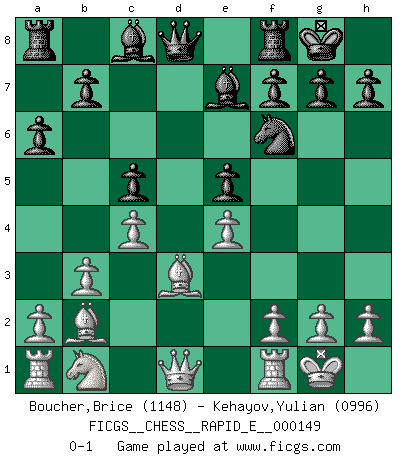 Last move : 0-1 2015 May 20 22:44:56 [Event "FICGS__CHESS__RAPID_E__000149"] [Site "FICGS"] [Date "2015.03.22"] [Round "1"] [White "Boucher,Brice"] [Black "Kehayov,Yulian"] [Result "0-1"] [WhiteElo "1148"] [BlackElo "0996"] 1.b3 e5 2.Bb2 d6 3.e4 a6 4.Nf3 Nf6 5.d4 Nbd7 6.Bd3 Be7 7.O-O O-O 8.c4 c5 9.dxe5 Nxe5 10.Nxe5 dxe5 0-1 This chess game has been lost on time (started : 2015.03.22 14:20:32) Nimzovich-Larsen attack : Modern variation Kingside Castling by player White (move 7) Kingside Castling by player Black (move 7) Player Black won this chess game. Follow this game move after move (download)Openings teach you openings. Endgames teach you chess ! (Stephan Gerzadowicz) Es hat in meinem Leben Zeiten gegeben, in denen das Schachspiel, wenn nicht zum Lebenszweck, so doch zu einem regelrechten Lebensersatz geworden ist. Man fühlt sich in solchen Zeiten nicht so, als besäße man eine göttliche Gabe, sondern eher so, als sei man von ihr besessen. (Garry Kasparov) Yo no creo en la psicología. Yo creo en las buenas movidas. (Bobby Fischer) La victoire dans une partie d'Echecs appartient la plupart du temps à celui qui voit un peu plus loin que l'adversaire. (Lasker) Always two there are. No more no less. A master, and an apprentice. (Master Yoda in Star Wars ep.1)