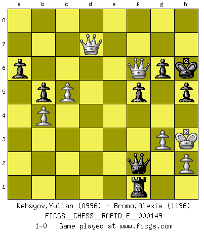 Last move : 1-0 2015 May 8 22:37:2 [Event "FICGS__CHESS__RAPID_E__000149"] [Site "FICGS"] [Date "2015.03.22"] [Round "1"] [White "Kehayov,Yulian"] [Black "Bromo,Alexis"] [Result "1-0"] [WhiteElo "0996"] [BlackElo "1196"] 1.g3 d5 2.Bg2 Nf6 3.d4 h6 4.Nf3 Nc6 5.O-O e6 6.Nc3 a6 7.Re1 Bd6 8.e4 dxe4 9.Nxe4 Nxe4 10.c3 Bd7 11.Rxe4 O-O 12.b3 f5 13.Re1 Ne7 14.c4 b6 15.Bb2 Ng6 16.d5 e5 17.Nxe5 Nxe5 18.Bxe5 Bxe5 19.Rxe5 Qf6 20.Re1 Rae8 21.Rxe8 Rxe8 22.Qd2 Qxa1+ 23.Bf1 Re1 24.Qd3 Qxa2 25.d6 c6 26.c5 b5 27.Kg2 Be6 28.b4 Bd5+ 29.Kh3 Qxf2 30.d7 Rxf1 31.d8Q+ Kh7 32.Qd8xd5 h5 33.Qxc6 g6 34.Qd3d7+ Kh6 35.Qf6 1-0 Benko's Opening Kingside Castling by player White (move 5) Kingside Castling by player Black (move 11) Promotion Queen by player White (move 31) Player White won this chess game. Follow this game move after move (download)Chess is the art which expresses the science of logic. (Mikhail Botvinnik) Ich glaube nicht an Psychologie, ich glaube an gute Züge. (Robert James Fischer) Te sientas frente a un tablero y repentinamente tu corazón brinca. Tu mano tiembla al tomar una pieza y moverla. Pero lo que el Ajedrez te enseña es que tu debes permanecer ahí con calma y pensar de que si realmente es una buena idea o de que si hay otras ideas mejores. (Stanley Kubrick) L'action d'une oeuvre littéraire se déroule sur un champ de bataille. Les masques et les types du drame moderne correspondent aux pièces du jeu d'échecs. L'intrigue correspond aux coups et aux gambits, c'est à dire aux techniques du jeu telles qu'utilisées et interprétées par les joueurs. Les tactiques et les péripéties [mouvements] correspondent aux coups exécutés par l'adversaire. (Viktor Shklovsky) Experience is the name we all give to our mistakes. (Oscar Wilde)
