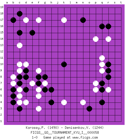 Last move : 1-0 2015 June 6 11:57:49 [Event "FICGS__GO__TOURNAMENT_KYU_I__000058 "] [Site "FICGS"] [Date "2015.03.22"] [Round "1"] [Black "Korossy,Peter "] [White "Denisenkov,Valentin "] [Result "1-0"] [Rating 1 "1490"] [Rating 2 "1244"] 1.q16 d4 2.q4 d17 3.c15 c13 4.e15 f17 5.b17 c10 6.c18 k17 7.n17 r6 8.r8 p6 9.o3 q9 10.r9 q10 11.r10 q11 12.q7 p7 13.q6 r14 14.r16 p14 15.k10 k4 16.h4 n4 17.d6 f3 18.d9 b8 19.c7 b7 20.b6 d10 21.c3 c4 22.b4 c5 23.b5 c6 24.c8 c9 25.d8 f9 26.f7 f5 27.h6 g7 28.g6 f6 29.f8 e7 30.g8 1-0 This go game has been lost on time (started : 2015.03.22 23:7:38) Here are the names of the openings (joseki) played in the four corners : Corner d16 : d17 c15Komoku (Somok, Xiao~mu`) 3-4 Point. The komoku (3-4) point is the traditional corner enclosure move..Ikken Kakari (Hankan Keolch'im, Yi Gua`jiao~, 1-Space Low Pincer). The small knight move is the basic approach move to the 3-4 point stone. It has been continually used for over four centuries. There are limitless variations, with new moves constantly being discovered. Black 2 opens the door to a treaure store of joseki. Corner q4 : q4 r6Hoshi (Hwajeom, Seongjeom, Xingwei`) 4-4 Point. The star or hoshi (4-4) point, emphasizing influence at the potential expense of territory.Ikken Kakari (Hankan Keolch'im, Yi Gua`jiao~, 1-Space Low Approach). White 2 is the standard approach move to the 4-4. Corner d4 : d4 h4Hoshi (Hwajeom, Seongjeom, Xingwei`) 4-4 Point. The star or hoshi (4-4) point, emphasizing influence at the potential expense of territory. Player Black won this Go (weiqi, baduk) game.Follow this game move after move (download ) You have to like to win, and to learn to recognize the errors that gave you the victory. (Pierre Audouard) Good decisions come from experience, and experience comes from bad decisions. (Anonymous)