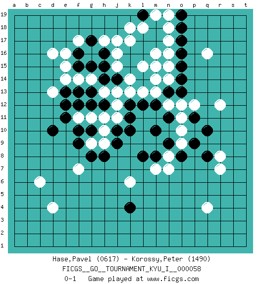 Last move : 0-1 2015 July 27 21:41:4 [Event "FICGS__GO__TOURNAMENT_KYU_I__000058"] [Site "FICGS"] [Date "2015.03.22"] [Round "1"] [Black "Hase,Pavel"] [White "Korossy,Peter"] [Result "0-1"] [Rating 1 "0617"] [Rating 2 "1490"] 1.q10 d4 2.k4 q4 3.k10 d16 4.d10 q16 5.k12 o10 6.p11 o11 7.p9 n12 8.n9 o9 9.o8 n8 10.m8 n7 11.m10 p12 12.n11 m7 13.l8 r8 14.q8 r7 15.m12 r12 16.n13 o12 17.o13 m13 18.m14 l13 19.l14 k13 20.j14 j13 21.h14 h13 22.g13 h11 23.h12 j12 24.g12 j11 25.k11 h9 26.j9 n14 27.o14 n15 28.o15 n16 29.o16 n17 30.o17 k14 31.k15 l15 32.k16 g14 33.l16 m16 34.m17 n18 35.o18 j15 36.h15 j16 37.g15 j17 38.l17 k18 39.m18 m19 40.l19 n19 41.o19 m15 42.l14 m14 43.g10 h10 44.h8 g9 45.f9 g11 46.f10 f11 47.f13 f14 48.e13 e15 49.e11 k6 50.g8 l18 51.h16 f17 52.f16 e16 53.f15 e14 54.f12 d13 55.e12 c6 56.j10 f7 57.g17 h17 58.l12 k17 0-1 Here are the names of the openings (joseki) played in the four corners : Corner q16 : q16 p11 Hoshi (Hwajeom, Seongjeom, Xingwei`) 4-4 Point. The star or hoshi (4-4) point, emphasizing influence at the potential expense of territory. Corner q4 : q4 p9 Hoshi (Hwajeom, Seongjeom, Xingwei`) 4-4 Point. The star or hoshi (4-4) point, emphasizing influence at the potential expense of territory. Corner d16 : d16 j14 Hoshi (Hwajeom, Seongjeom, Xingwei`) 4-4 Point. The star or hoshi (4-4) point, emphasizing influence at the potential expense of territory. Player White won this Go (weiqi, baduk) game. Follow this game move after move (download)There is death in the hane. (Anonymous) Lamb in skin of tiger, still fears the wolf. (Chinese proverb)