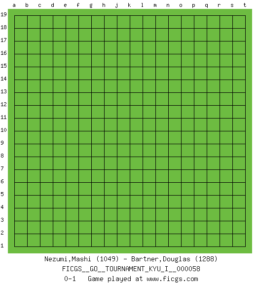 Last move : 0-1 2015 April 22 7:50:29 [Event "FICGS__GO__TOURNAMENT_KYU_I__000058"] [Site "FICGS"] [Date "2015.03.22"] [Round "1"] [Black "Nezumi,Mashi"] [White "Bartner,Douglas"] [Result "0-1"] [Rating 1 "1049"] [Rating 2 "1288"] 0-1 This go game has been lost on time (started : 2015.03.22 23:7:38) Here are the names of the openings (joseki) played in the four corners : Player White won this Go (weiqi, baduk) game. Follow this game move after move (download)The L-group is dead. (Anonymous) Looking at the proliferation of personal web pages on the Net, it looks like very soon everyone on Earth will have 15 megabytes of fame. (M.G. Sriram)
