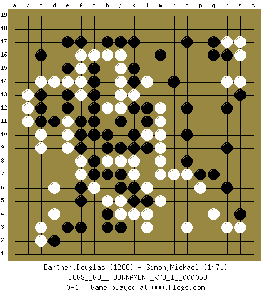Last move : 0-1 2015 May 15 21:53:46 [Event "FICGS__GO__TOURNAMENT_KYU_I__000058"] [Site "FICGS"] [Date "2015.03.22"] [Round "1"] [Black "Bartner,Douglas"] [White "Simon,Mickael"] [Result "0-1"] [Rating 1 "1288"] [Rating 2 "1471"] 1.q16 q4 2.c16 d4 3.e17 c10 4.f3 d6 5.j3 r14 6.o17 s16 7.r6 o3 8.s4 r3 9.r9 l3 10.d2 c3 11.k17 c14 12.r12 r17 13.q17 s3 14.r16 s17 15.s13 s14 16.m16 c2 17.e3 p6 18.q7 e10 19.e15 h5 20.h4 j16 21.j17 h16 22.e13 j13 23.c12 b12 24.c11 b11 25.c13 b13 26.j11 l14 27.n14 m12 28.o12 m10 29.o10 m8 30.p7 o7 31.o8 n7 32.k12 k13 33.h17 g16 34.f17 d14 35.e12 e14 36.g12 f15 37.f10 e11 38.f11 e9 39.f5 g9 40.f9 f8 41.g8 f7 42.h9 h8 43.g7 g6 44.h7 j8 45.j7 k7 46.j9 k8 47.j6 j5 48.k6 l6 49.k5 k4 50.l5 m5 51.k9 m7 52.f6 j4 53.h3 g10 54.g11 l4 55.h10 g9 56.g10 h12 57.l9 m9 58.l11 m11 59.g13 f13 60.k10 j12 61.l12 l10 62.g14 f14 63.d11 c9 64.g15 f16 65.k15 j15 66.k14 j14 0-1 Here are the names of the openings (joseki) played in the four corners : Corner d4 : d4 f3 Hoshi (Hwajeom, Seongjeom, Xingwei`) 4-4 Point. The star or hoshi (4-4) point, emphasizing influence at the potential expense of territory. Ikken Kakari (Hankan Keolch'im, Yi Gua`jiao~, 1-Space Low Approach). Black 2 is the standard approach move to the 4-4. Corner q16 : q16 r14 Hoshi (Hwajeom, Seongjeom, Xingwei`) 4-4 Point. The star or hoshi (4-4) point, emphasizing influence at the potential expense of territory. Ikken Kakari (Hankan Keolch'im, Yi Gua`jiao~, 1-Space Low Approach). White 2 is the standard approach move to the 4-4. Corner q4 : q4 r6 Hoshi (Hwajeom, Seongjeom, Xingwei`) 4-4 Point. The star or hoshi (4-4) point, emphasizing influence at the potential expense of territory. Ikken Kakari (Hankan Keolch'im, Yi Gua`jiao~, 1-Space Low Approach). Black 2 is the standard approach move to the 4-4. Player White won this Go (weiqi, baduk) game. Follow this game move after move (download)You have to like to win, and to learn to recognize the errors that gave you the victory. (Pierre Audouard) Just because you do not take an interest in politics doesn't mean politics won't take an interest in you. (Pericles 430 B.C.)