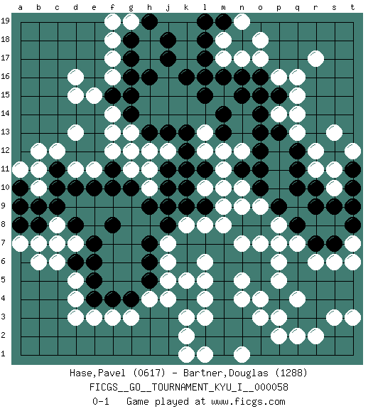 Last move : 0-1 2015 October 30 20:14:43 [Event "FICGS__GO__TOURNAMENT_KYU_I__000058"] [Site "FICGS"] [Date "2015.03.22"] [Round "1"] [Black "Hase,Pavel"] [White "Bartner,Douglas"] [Result "0-1"] [Rating 1 "0617"] [Rating 2 "1288"] 1.d10 d4 2.k10 d16 3.k16 f17 4.j17 q16 5.l15 q14 6.m14 d13 7.h16 q4 8.g15 k3 9.q10 o17 10.n15 r6 11.o14 r12 12.p13 q13 13.q12 r11 14.q11 n4 15.r9 c7 16.d8 d7 17.f8 f3 18.e7 k8 19.j9 m9 20.l9 l8 21.m10 n9 22.o10 n10 23.n11 o9 24.p9 p8 25.q8 p7 26.j8 j7 27.h7 j6 28.h6 j5 29.h5 h4 30.g4 g3 31.d6 c6 32.e5 d5 33.e6 f13 34.g14 g13 35.h13 d11 36.e10 e11 37.f11 c8 38.c9 h12 39.j13 j12 40.k12 f12 41.g10 m17 42.m16 n17 43.o16 p16 44.b8 b6 45.e4 e3 46.f4 q7 47.r7 s6 48.s7 d15 49.g17 f16 50.f15 e15 51.g16 f18 52.g18 g19 53.h19 f19 54.j18 m11 55.o11 l10 56.k9 m12 57.l11 m10 58.m13 l12 59.k11 l13 60.k13 b11 61.c11 c12 62.c10 f14 63.l17 p14 64.o13 n12 65.o12 t7 66.t8 t6 67.t9 s10 68.s9 m18 69.l18 b10 70.b9 g11 71.f10 h10 72.h9 g12 73.a10 b12 74.p15 q15 75.o15 d3 76.m19 n19 77.l19 o18 78.r10 s11 79.t10 s13 80.t11 t12 81.n3 o3 82.o2 p3 83.m2 p2 84.p1 q2 85.q1 r2 86.r1 n1 87.n2 l3 88.l2 k2 89.s2 s3 90.m1 b7 91.a8 a11 92.a9 a7 93.m3 l4 94.m4 n5 95.m5 l5 96.m6 l6 97.m7 m8 98.l7 o7 99.k7 n7 100.n6 p5 101.o6 p6 102.o5 o4 103.k6 j4 104.t2 s1 105.t1 t3 106.o1 k1 107.s1 k5 108.j11 h11 109.j10 l1 110.l16 r17 111.n16 n1 0-1 Here are the names of the openings (joseki) played in the four corners : Corner q16 : q16 l15 Hoshi (Hwajeom, Seongjeom, Xingwei`) 4-4 Point. The star or hoshi (4-4) point, emphasizing influence at the potential expense of territory. Player White won this Go (weiqi, baduk) game. Follow this game move after move (download)Nothing requires doing this or that, but necessity exists. (Pierre Audouard) At last I discovered the true beauty of chess. So I proposed to her. (Dinesh De Silva)