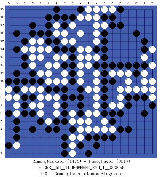 Last move : 1-0 2015 October 25 14:15:22 [Event "FICGS__GO__TOURNAMENT_KYU_I__000058"] [Site "FICGS"] [Date "2015.03.22"] [Round "1"] [Black "Simon,Mickael"] [White "Hase,Pavel"] [Result "1-0"] [Rating 1 "1471"] [Rating 2 "0617"] 1.r16 q10 2.d17 k16 3.d4 k10 4.q4 k4 5.p17 m16 6.r12 k18 7.c15 h16 8.c10 h10 9.o3 m4 10.q8 p9 11.e10 f10 12.c6 e9 13.d10 e11 14.n6 m6 15.n7 m7 16.n8 m8 17.n9 m9 18.n10 m10 19.n12 l12 20.h3 n5 21.o5 l5 22.h5 c11 23.d11 d12 24.e12 f11 25.c12 d13 26.c13 e13 27.m14 l14 28.m12 m11 29.n11 m13 30.n13 l13 31.n14 m15 32.h7 f12 33.f15 c9 34.b11 d9 35.b9 b8 36.a10 a8 37.c8 a9 38.b10 b7 39.c7 b6 40.b5 a5 41.a6 d7 42.f9 f8 43.g9 g8 44.h9 j9 45.h8 g7 46.h6 g6 47.g5 f5 48.f4 e6 49.d8 e8 50.d6 e7 51.e5 o4 52.p4 n4 53.n18 n17 54.o17 m18 55.g18 f14 56.g15 e15 57.e16 d15 58.d16 c14 59.d14 e14 60.b14 d14 61.b16 n19 62.o18 o19 63.p19 m19 64.h14 h15 65.g14 g13 66.h12 h13 67.j13 g12 68.j14 j15 69.j11 k13 70.j10 g10 71.k9 k11 72.j8 l9 73.m2 l2 74.l3 k3 75.k2 j2 76.l1 j3 77.h2 j1 78.h1 h4 79.g4 j5 80.j18 j17 81.h17 g17 82.h18 j19 83.f17 g16 84.f16 h19 85.f18 k14 86.k6 k5 87.m3 l6 88.g19 l18 89.n16 m17 90.n15 r9 91.r8 s10 92.r11 s9 93.s8 t8 94.t7 t9 95.s6 s11 96.s12 t12 97.t11 t10 98.n3 l4 99.k19 l19 100.k8 h11 101.j12 k12 102.j4 j6 103.k7 q9 104.p12 q11 105.q12 p11 106.o10 s13 107.s14 p8 108.q7 p7 109.p6 o7 110.o6 t14 111.s15 o11 112.o12 a4 113.b4 a3 114.b3 b2 115.a2 1-0 Here are the names of the openings (joseki) played in the four corners : Player Black won this Go (weiqi, baduk) game. Follow this game move after move (download)Strike at the waist of the knight's move. (Anonymous) No, no, you're not thinking; you're just being logical. (Niels Bohr)