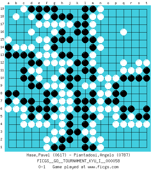 Last move : 0-1 2015 December 3 19:57:53 [Event "FICGS__GO__TOURNAMENT_KYU_I__000058"] [Site "FICGS"] [Date "2015.03.22"] [Round "1"] [Black "Hase,Pavel"] [White "Piantadosi,Angelo"] [Result "0-1"] [Rating 1 "0617"] [Rating 2 "0787"] 1.d10 d4 2.k10 q4 3.q10 d16 4.k16 q16 5.j15 g17 6.h16 g16 7.g15 f15 8.g14 g12 9.e14 f14 10.f13 f12 11.e12 g13 12.h13 h12 13.j13 e13 14.d13 f13 15.h15 j12 16.k12 e11 17.d12 d11 18.c11 e10 19.d9 d14 20.c13 e15 21.e9 f9 22.f8 g9 23.g8 h9 24.j9 h8 25.h7 j8 26.k8 j7 27.k7 j6 28.k6 g7 29.f7 h6 30.j5 h5 31.j4 h4 32.j3 h3 33.h2 g2 34.j2 g3 35.g1 f1 36.h1 f2 37.l5 n5 38.j11 h11 39.h10 g10 40.j10 o10 41.h18 h17 42.j18 j17 43.k17 q12 44.g18 f18 45.f19 f17 46.e18 e17 47.d19 d18 48.e19 c19 49.g19 n15 50.l16 m16 51.l15 m13 52.l13 m12 53.m14 n14 54.m15 m17 55.l18 m18 56.m19 n19 57.l19 n18 58.l11 m9 59.m11 n11 60.m8 n7 61.m7 m6 62.l6 n8 63.m5 m4 64.l4 m3 65.l2 m2 66.m1 n1 67.l1 l3 68.k3 n2 69.p9 o9 70.p8 p10 71.q8 o8 72.p7 p6 73.q6 p5 74.q5 r5 75.r6 r4 76.s5 s4 77.t5 t4 78.t6 q11 79.r10 r11 80.s10 s11 81.t11 t12 82.t10 s12 83.o7 o6 84.n6 p4 85.g6 h7 86.f5 c14 87.b13 b14 88.a14 a15 89.a13 b18 90.c10 e5 91.e6 f4 92.d5 e4 93.d7 c5 94.d6 c6 95.c7 b7 96.b8 b6 97.a7 a6 98.a8 g5 99.f6 c4 100.l17 m6 101.l7 l9 102.m10 n10 103.l12 n6 0-1 This go game has been lost on time (started : 2015.03.22 23:7:38) Here are the names of the openings (joseki) played in the four corners : Corner d16 : d16 j15 Hoshi (Hwajeom, Seongjeom, Xingwei`) 4-4 Point. The star or hoshi (4-4) point, emphasizing influence at the potential expense of territory. Corner d4 : d4 d9 Hoshi (Hwajeom, Seongjeom, Xingwei`) 4-4 Point. The star or hoshi (4-4) point, emphasizing influence at the potential expense of territory. Corner q4 : q4 l5 Hoshi (Hwajeom, Seongjeom, Xingwei`) 4-4 Point. The star or hoshi (4-4) point, emphasizing influence at the potential expense of territory. Player White won this Go (weiqi, baduk) game. Follow this game move after move (download)If a formation is symmetrical, play at the center. (Anonymous) The beginning of wisdom is silence. The second step is listening. (Unknown)