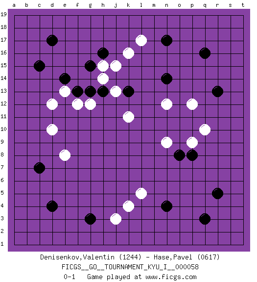 Last move : 0-1 2015 June 19 1:30:38 [Event "FICGS__GO__TOURNAMENT_KYU_I__000058"] [Site "FICGS"] [Date "2015.03.22"] [Round "1"] [Black "Denisenkov,Valentin"] [White "Hase,Pavel"] [Result "0-1"] [Rating 1 "1244"] [Rating 2 "0617"] 1.q16 k11 2.q3 k4 3.d17 k16 4.d4 d10 5.c15 d12 6.r5 q10 7.r13 p12 8.n17 l17 9.c7 e8 10.n4 l5 11.g3 j3 12.n14 n12 13.o8 p9 14.p8 n9 15.h16 h15 16.g15 h14 17.e14 e13 18.f13 f12 19.g13 g12 20.h13 j15 21.k13 j13 0-1 This go game has been lost on time (started : 2015.03.22 23:7:38) Here are the names of the openings (joseki) played in the four corners : Player White won this Go (weiqi, baduk) game. Follow this game move after move (download)There is damezumari at the bamboo joint. (Anonymous) Now the reason the enlightened prince and the wise general conquer the enemy whenever they move and their achievements surpass those of ordinary men is foreknowledge. (Sun Tzu)