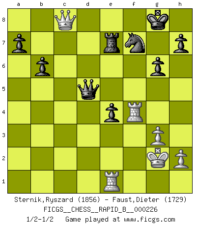 Last move : 1/2-1/2 2015 June 22 16:53:14 [Event "FICGS__CHESS__RAPID_B__000226"] [Site "FICGS"] [Date "2015.03.23"] [Round "1"] [White "Sternik,Ryszard"] [Black "Faust,Dieter"] [Result "1/2-1/2"] [WhiteElo "1856"] [BlackElo "1729"] 1.Nf3 Nf6 2.c4 b6 3.g3 c5 4.Bg2 Bb7 5.O-O g6 6.Nc3 Bg7 7.d4 cxd4 8.Nxd4 Bxg2 9.Kxg2 Qc8 10.b3 Nc6 11.Bb2 Qb7 12.e4 Nxe4 13.Nxe4 Nxd4 14.Re1 Nf5 15.Bxg7 Nxg7 16.Qf3 Kf8 17.Rad1 Ne6 18.Qc3 Rg8 19.f3 Rc8 20.Qd2 d6 21.Qh6+ Rg7 22.Nc3 g5 23.a4 g4 24.Nd5 gxf3+ 25.Kf2 Re8 26.Rd3 Ng5 27.Rde3 Ne6 28.Rxf3 Kg8 29.Qh5 Qd7 30.Kg2 Rg6 31.Qf5 Rf8 32.Re4 Qb7 33.Qh5 Qd7 34.Rh4 Rg7 35.Qf5 Rg6 36.Re3 Re8 37.R3e4 Qd8 38.Nf4 Ng5 39.Nxg6 e6 40.Qg4 fxg6 41.Rf4 e5 42.Rf1 d5 43.cxd5 Qxd5+ 44.Kg1 e4 45.Qe2 Qxb3 46.Kh1 Qxa4 47.Rg4 Nf7 48.Rgf4 Re7 49.Qe3 Qd7 50.Kg1 Qd3 51.Qf2 Qd5 52.Qc2 Qd4+ 53.Kg2 Kg7 54.Qb3 Qd7 55.Qc3+ Kg8 56.Re1 Qd5 57.Qc8+ 1/2-1/2 Reti Opening Kingside Castling by player White (move 5) This chess game ended in a draw. Follow this game move after move (download)There just isn't enough televised Chess. (David Letterman) Im Wettkampf zwischen starken Meistern kommen Fehler sehr selten vor, deshalb ist es mit bloßem Warten nicht getan. (José Raúl Capablanca) No volvere nunca a jugar contigo. Has insultado a mi amigo. - cuando un oponente se maldijo por una mala jugada (Miguel Najdorf) Des points faibles ou des trous dans la position de l'adversaire doivent être occupés par des pièces et non pas par des pions. (Siegbert Tarrasch) Live, lose, and learn, by observing your opponent how to win. (Amber Steenbock)