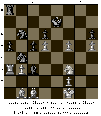 Last move : 1/2-1/2 2015 May 9 18:31:16 [Event "FICGS__CHESS__RAPID_B__000226"] [Site "FICGS"] [Date "2015.03.23"] [Round "1"] [White "Lubas,Jozef"] [Black "Sternik,Ryszard"] [Result "1/2-1/2"] [WhiteElo "1828"] [BlackElo "1856"] 1.e4 e5 2.Nf3 Nc6 3.Bb5 a6 4.Ba4 Nf6 5.O-O b5 6.Bb3 Bb7 7.c3 Be7 8.d4 d6 9.Nbd2 O-O 10.Bc2 exd4 11.cxd4 Nb4 12.Bb1 c5 13.d5 a5 14.a3 Na6 15.Qe2 Qd7 16.a4 bxa4 17.Nc4 Nb4 18.Nb6 Ba6 19.Nxd7 Bxe2 20.Nxf8 Bxf1 21.Kxf1 Kxf8 22.Rxa4 Nd7 23.g4 Nb6 24.Ra3 h6 25.h4 Bf6 26.b3 Ke7 27.g5 Bc3 28.gxh6 gxh6 29.h5 f5 30.exf5 1/2-1/2 Ruy Lopez : Archangelsk (counterthrust) variation Kingside Castling by player White (move 5) Kingside Castling by player Black (move 9) This chess game ended in a draw. Follow this game move after move (download)Chess is a beautiful mistress. (Bent Larsen) Fischer machte Schach einfach zu einer aufregenden Sache, wann immer er sich ans Brett setzte. (Raymond Keene) Cuando la partida de Ajedrez termina, el Peón y el Rey regresan a la misma caja. (Irish saying) Il a essayé de se convaincre qu'il pourrait empêcher toutes les erreurs et ne jamais perdre. L'horreur ! Gary Kasparov au sujet de Robert Fischer. The man who strikes first admits that his ideas have given out. (Chinese proverb)
