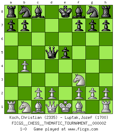Last move : 1-0 2006 July 20 14:20:49 [Event "FICGS__CHESS__THEMATIC_TOURNAMENT__000002"] [Site "FICGS"] [Date "2006.05.30"] [Round "1"] [White "Koch,Christian"] [Black "Luptak,Jozef"] [Result "1-0"] [WhiteElo "2335"] [BlackElo "1700"] 1.e4 c5 2.b4 cxb4 3.Nf3 d5 4.exd5 Qxd5 5.a3 e5 6.axb4 1-0 This chess game has been lost on time (started : 2006.05.30 1:4:16) Sicilian : wing gambit Player White won this chess game. Follow this game move after move (download)Up to this point White has been following well-known analysis. But now he makes a fatal error: he begins to use his own head. (Siegbert Tarrasch) Ich würde mich als ganz normalen Jungen bezeichnen [Im Alter von 12]. (Sergej Karjakin) El Ajedrez expande y enriquece tu mente. (Saudin Robovic) Les Echecs ont trois composantes : le temps, l'espace et le matériel en dernier. (Mikhail Tal) Is not life a hundred times too short to bore ourselves ? (Friedrich Nietzsche)