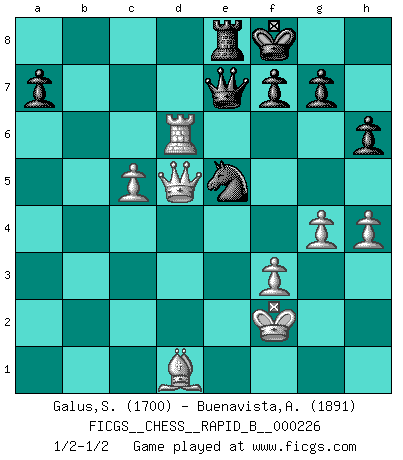 Last move : 1/2-1/2 2015 June 5 11:20:8 [Event "FICGS__CHESS__RAPID_B__000226"] [Site "FICGS"] [Date "2015.03.23"] [Round "1"] [White "Galus,Stanislaw"] [Black "Buenavista,Anthony"] [Result "1/2-1/2"] [WhiteElo "1700"] [BlackElo "1891"] 1.Nf3 d5 2.g3 c5 3.Bg2 Nf6 4.O-O Nc6 5.d4 cxd4 6.Nxd4 e5 7.Nxc6 bxc6 8.c4 Be6 9.Qa4 Qd7 10.Nc3 Rc8 11.Rd1 d4 12.e3 Bg4 13.f3 Be6 14.b3 Be7 15.Qa5 Qb7 16.Na4 Nd7 17.Qe1 Nb6 18.Nb2 O-O 19.Nd3 Nd7 20.exd4 exd4 21.Bb2 Bf6 22.Nf4 Bxc4 23.Bxd4 Bb5 24.a4 Bxd4+ 25.Rxd4 c5 26.Rd6 Rce8 27.Qc3 Bc6 28.Kf2 Re7 29.Re1 Rxe1 30.Qxe1 c4 31.bxc4 Bxa4 32.Bf1 Qc7 33.Qd2 Bc6 34.Qd4 Re8 35.Be2 Ne5 36.c5 Kf8 37.h4 h6 38.Nd5 Qc8 39.g4 Qb7 40.Bd1 Bxd5 41.Qxd5 Qe7 1/2-1/2 Reti : King's Indian attack Kingside Castling by player White (move 4) Kingside Castling by player Black (move 18) This chess game ended in a draw. Follow this game move after move (download)The battle for the ultimate truth will never be won. And that's why Chess is so fascinating. (Hans Kmoch) Ich spiele 70 Eröffnungssysteme. (Viktor Kortschnoi) Aún deseo matar a Fischer. (Boris Spassky) Il vaut toujours mieux jouer un plan faux de façon logique que de n'avoir pas de plan du tout. (Victor Kortchnoï) Macintosh - we might not get everything right, but at least we knew the century was going to end. (Douglas Adams)