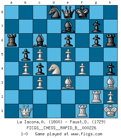 Last move : 1-0 2015 May 29 10:59:49 [Event "FICGS__CHESS__RAPID_B__000226"] [Site "FICGS"] [Date "2015.03.23"] [Round "1"] [White "La Iacona,Alessandro"] [Black "Faust,Dieter"] [Result "1-0"] [WhiteElo "1800"] [BlackElo "1729"] 1.e4 e6 2.d4 d5 3.Nc3 Nf6 4.e5 Nfd7 5.f4 c5 6.Nf3 Nc6 7.Be3 Qb6 8.Na4 Qa5+ 9.c3 c4 10.b4 Qc7 11.g3 Be7 12.Bh3 b5 13.Nc5 Nxc5 14.dxc5 a5 15.a3 h5 16.O-O h4 17.g4 Bd7 18.g5 Ra6 19.Qe1 Kf8 20.g6 fxg6 21.Qb1 Rh6 22.Ra2 Qb8 23.Rg2 axb4 24.axb4 Qe8 25.Ng5 Nd8 26.Kh1 Bc6 27.Nf3 d4 28.Nxd4 1-0 French : Steinitz, Boleslavsky variation Kingside Castling by player White (move 16) Player White won this chess game. Follow this game move after move (download)After black's reply to 1.e4 with 1..e5, leaves him always trying to get into the game. (Howard Staunton) Habe Mut, dich deines eigenen Verstandes zu bedienen. (Immanuel Kant) Si yo gano un torneo, yo lo gano por mí mismo. Yo hago las jugadas. Nadie me ayuda. (Bobby Fischer) Les échecs, c'est l'imagination. (David Bronstein) If computers get too powerful, we can organize them into committees. That'll do them in. (Anonymous)