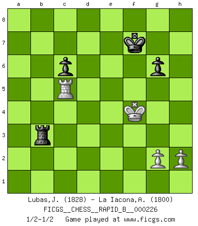 Last move : 1/2-1/2 2015 May 9 21:16:10 [Event "FICGS__CHESS__RAPID_B__000226"] [Site "FICGS"] [Date "2015.03.23"] [Round "1"] [White "Lubas,Jozef"] [Black "La Iacona,Alessandro"] [Result "1/2-1/2"] [WhiteElo "1828"] [BlackElo "1800"] 1.e4 c5 2.Nf3 d6 3.d4 cxd4 4.Nxd4 Nf6 5.Nc3 a6 6.Bg5 e6 7.f4 Qb6 8.Qd2 Qxb2 9.Rb1 Qa3 10.f5 Nc6 11.fxe6 fxe6 12.Nxc6 bxc6 13.Be2 Be7 14.O-O O-O 15.Rb3 Qc5+ 16.Kh1 Rf7 17.Be3 Qe5 18.Bf4 Nxe4 19.Nxe4 Qxe4 20.Bxd6 Bxd6 21.Qxd6 Rxf1+ 22.Bxf1 Qd5 23.Qe7 Qd7 24.Rb7 Qxe7 25.Rxe7 Kf8 26.Rc7 e5 27.Bc4 Rb8 28.Kg1 g6 29.Kf2 Bf5 30.Bb3 a5 31.Rxh7 Rb4 32.Rf7+ Ke8 33.Ra7 Bxc2 34.Rxa5 Bxb3 35.Rxe5+ Kf7 36.axb3 Rxb3 37.Rc5 Rb2+ 38.Kf3 Rb3+ 39.Kf4 Rb4+ 40.Kg3 Rb3+ 41.Kf4 1/2-1/2 Sicilian : Najdorf, 7...Qb6 Kingside Castling by player White (move 14) Kingside Castling by player Black (move 14) 10 pieces endgame at move 35 : White KRPPP , Black KRBPP WHITE : King + 1 Rook 3 Pawns BLACK : King + 1 Rook 1 Bishop 2 Pawns 9 pieces endgame at move 36 : White KRPPP , Black KRPP WHITE : King + 1 Rook 3 Pawns BLACK : King + 1 Rook 2 Pawns 8 pieces endgame at move 36 : White KRPP , Black KRPP WHITE : King + 1 Rook 2 Pawns BLACK : King + 1 Rook 2 Pawns This chess game ended in a draw. Follow this game move after move (download)When your house is on fire, you can't be bothered with the neighbors. Or, as we say in Chess, if your King is under attack you don't worry about losing a Pawn on the Queen's side. (Gary Kasparov) Fischer ist das größte Genie, das je vom Schachhimmel heruntergestiegen ist. (Mikhail Nekhemyevich Tal) El Peón aislado arroja penumbra sobre todo el tablero. (Aaron Nimzovich) En blitz, le Cavalier l'emporte sur le Fou. (Vlastimil Hort) My poor ole parrot... Is not in the circulation of displays ....poo hoo hoo :) (Wayne Lowrance's enigma)