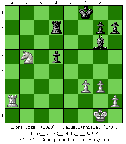 Last move : 1/2-1/2 2015 May 4 6:32:34 [Event "FICGS__CHESS__RAPID_B__000226"] [Site "FICGS"] [Date "2015.03.23"] [Round "1"] [White "Lubas,Jozef"] [Black "Galus,Stanislaw"] [Result "1/2-1/2"] [WhiteElo "1828"] [BlackElo "1700"] 1.e4 e6 2.d4 d5 3.Nd2 Nf6 4.e5 Nfd7 5.c3 c5 6.Bd3 Nc6 7.Ne2 cxd4 8.cxd4 f6 9.exf6 Nxf6 10.O-O Bd6 11.Nf3 O-O 12.Bf4 Bxf4 13.Nxf4 Ng4 14.Qd2 Qf6 15.Ne2 e5 16.Nxe5 Ncxe5 17.dxe5 Nxe5 18.Rac1 Bg4 19.Bc2 Rad8 20.f3 Bh5 21.Bb3 Bg6 22.Rc3 Nc4 23.Qd4 b5 24.Qxf6 Rxf6 25.Nd4 a6 26.Re1 Rd7 27.g3 Nxb2 28.Rc8+ Rf8 29.Rxf8+ Kxf8 30.Re6 a5 31.Nxb5 a4 32.Re2 axb3 33.Rxb2 bxa2 34.Rxa2 1/2-1/2 French : Tarrasch, Closed variation Kingside Castling by player White (move 10) Kingside Castling by player Black (move 11) This chess game ended in a draw. Follow this game move after move (download)A passed Pawn increases in strength as the number of pieces on the board diminishes. (Capablanca) Ich bin stolz ein Bulgare zu sein. (Veselin Topalov) Una de estas pequeñas movidas modestas pudieran ser mas molestas a tu oponente que la amenaza mas grande. (Siegbert Tarrasch) Roi des jeux et jeu des rois, les échecs portent en eux un sentiment d'infini. Ils donnent à celui qui s'est efforcé d'en approfondir les arcanes l'impression de n'être pas à la mesure de l'homme; en fait, ils constituent un résumé de l'univers, un microcosme, et figurent cette grande échelle qui, dans les plans de la lumière descend jusqu'à la matière, qui des abîmes insondables remonte jusqu'en l'infini de Dieu. (Pyrame) However beautiful the strategy, you should occasionally look at the results. (Winston Churchill)