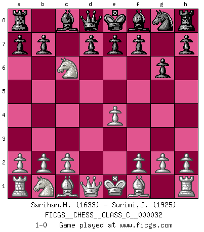 Last move : 1-0 2007 May 1 13:22:0 [Event "FICGS__CHESS__CLASS_C__000032"] [Site "FICGS"] [Date "2007.03.03"] [Round "1"] [White "Sarihan,Mustafa"] [Black "Surimi,Jean-Eudes"] [Result "1-0"] [WhiteElo "1633"] [BlackElo "1925"] 1.e4 c5 2.Nf3 Nc6 3.d4 cxd4 4.Nxd4 g6 5.Nxc6 1-0 This chess game has been lost on time (started : 2007.03.03 12:43:54) Sicilian : Accelerated Fianchetto, Exchange variation Player White won this chess game. Follow this game move after move (download)War is the child of passion, passion is the child of narcissism and narcissism is the child. (...) Another game ? (Thibault de Vassal) Ich bin der einzige Schachspieler, der sich während der Vorbereitungen zum Turnier verletzt hat. (Woody Allen) El Ajedrez es el juego mas altamente simbólico, pero las agresiones estan por lo tanto aún mas francamente representadas en la partida. Tal vez comenzo como un juego de guerra; Algo como la representación de una batalla en miniatura entre las fuerzas de dos reinos. (Karl Meninger) Les échecs sont utiles à l'exercice de la faculté de penser et à celle de l'imagination. Car nous devons posséder une méthode élaborée pour atteindre des buts partout où nous devons conduire notre raison. (Leibnitz) Industry executives and analysts often mistakenly talk about strategy as if it were some kind of chess match. But in chess, you have just two opponents, each with identical resources, and with luck playing a minimal role. The real world is much more like a poker game, with multiple players trying to make the best of whatever hand fortune has dealt them. In our industry, Bill Gates owns the table until someone proves otherwise. (David Moschella, 'Computerworld')