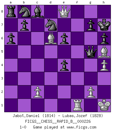 Last move : 1-0 2015 May 18 20:36:51 [Event "FICGS__CHESS__RAPID_B__000226"] [Site "FICGS"] [Date "2015.03.23"] [Round "1"] [White "Jabot,Daniel"] [Black "Lubas,Jozef"] [Result "1-0"] [WhiteElo "1814"] [BlackElo "1828"] 1.e4 c5 2.Nf3 d6 3.d4 cxd4 4.Nxd4 Nf6 5.Nc3 a6 6.Bg5 e6 7.f4 h6 8.Bh4 Qb6 9.Qd2 Qxb2 10.Rb1 Qa3 11.e5 dxe5 12.fxe5 Nfd7 13.Ne4 Qxa2 14.Rd1 Qd5 15.Qe3 Qxe5 16.Be2 Bc5 17.Bg3 Bxd4 18.Rxd4 Qa5+ 19.Rd2 O-O 20.Bd6 Re8 21.O-O f5 22.Qg3 fxe4 23.Qg6 Qxd2 24.Qxe8+ Kh7 25.Bh5 Qe3+ 26.Kh1 Qg5 27.h4 1-0 Sicilian : Najdorf, 7.f4 Kingside Castling by player Black (move 19) Kingside Castling by player White (move 21) Player White won this chess game. Follow this game move after move (download)A win by an unsound combination, however showy, fills me with artistic horror. (Wilhelm Steinitz) Kasparov stellt für gewöhnlich die Regeln auf und bricht sie dann selbst wieder. (Alexej Shirov) Un jugador que es sorprendido, esta derrotado a medias. (Proverbio) Le jeu d'échecs est comme rejeté hors du temps. (Antoine de Saint-Exupéry) Pretend inferiority and encourage his arrogance. (Sun Tzu)
