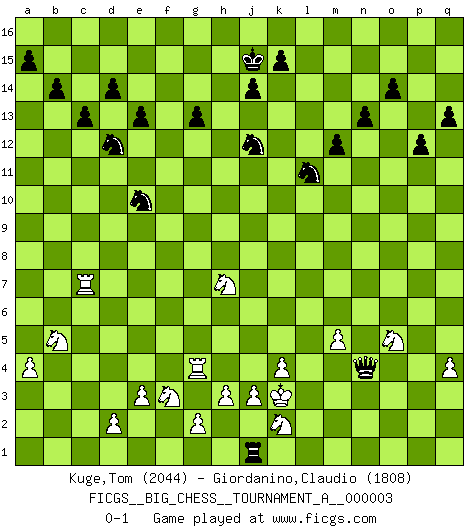 Last move : 0-1 2015 May 4 11:49:58 [Event "FICGS__BIG_CHESS__TOURNAMENT_A__000003"] [Site "FICGS"] [Date "2015.03.23"] [Round "1"] [White "Kuge,Tom"] [Black "Giordanino,Claudio"] [Result "0-1"] [WhiteElo "2044"] [BlackElo "1808"] 1.j2-k4 m15-m13 2.h1-o7 h15-g13 3.b2-b3 j15-k13 4.c1-b2 o15-o14 5.g1-f3 n15-n13 6.m2-m4 p16-n15 7.l1-p5 n15-p14 8.p5-g13 h14-g13 9.o7-f15 g16-f14 10.n2-n3 e15-e13 11.e2-e3 b16-c14 12.f1-c4 f16-b12 13.o1-g8 m13-m12 14.k4-j6 l16-p12 15.j6-g5 k16-h15 16.p1-o3 f14-h13 17.g8-k11 h15-f14 18.f15-g14 h16-h15 19.g14-g13 d15-d14 20.b1-a3 o16-j11 21.g13-g8 c16-l8 22.a3-b5 h15-c10 23.h2-j4 e16-e15 24.k1-h2 a16-f16 25.g8-k5 j16-j15 26.a2-a4 m16-h16 27.m4-m5 p14-o12 28.j1-j2 h13-f12 29.k2-k3 f14-h13 30.j4-k6 l8-o11 31.l2-l4 q16-m16 32.l4-l5 m16-m14 33.e1-l1 m14-k14 34.k5-b13 b15-b14 35.c4-d3 q15-q13 36.k11-f7 c10-c13 37.b13-g8 k13-l11 38.g8-o15 o12-n14 39.f7-n14 p12-n14 40.o15-l15 h16-p16 41.d3-c4 f16-l16 42.l15-k14 h13-k14 43.c4-n14 c13-c2 44.b2-c3 e15-f15 45.n14-p16 l16-p16 46.l1-c1 c2-g6 47.m1-m4 p16-h16 48.q1-l1 k14-j12 49.q2-q4 g6-g8 50.l1-l4 g8-b3 51.l4-c4 o11-m13 52.c4-j4 b3-k11 53.m4-p4 p15-p13 54.a1-b1 m13-n12 55.b1-b2 p13-p12 56.j4-h4 h16-h4 57.p4-h4 g15-g13 58.c3-b4 j11-b4 59.b2-b4 k11-g8 60.o3-m4 g8-o8 61.o2-o3 o8-l5 62.g5-h7 c14-d12 63.h4-l4 l5-n7 64.m4-o5 n7-q7 65.n3-n4 n12-h7 66.c1-c7 q7-p6 67.k6-h7 p6-p2 68.j2-j1 p2-o3 69.b4-c4 c15-c13 70.f3-g5 b12-l3 71.l4-l3 o3-l3 72.j1-j2 f12-e10 73.h2-j4 l3-m2 74.j4-k2 f15-f2 75.c4-g4 m2-n1 76.g5-f3 f2-f1 77.k3-k4 f1-j1 78.j2-k3 n1-n4 0-1 Follow this game move after move (download)Botvinnik tried to take the mystery out of Chess, always relating it to situations in ordinary life. He used to call Chess a typical inexact problem similar to those which people are always having to solve in everyday life. (Garry Kasparov) Über Kasparov: Es ist offensichtlich, daß er in einem totalitären Staat aufwuchs und deshalb zu diktatorischen Zügen neigt. (Viktor Kortschnoi) El Ajedrez es tan interesante por sí solo, que no es necesario un interés monetario para persuadir a una persona a que lo practique; por lo tanto, nunca se juega por dinero. (Benjamin Franklin) Le pion, dans sa simplicité, marche droit devant lui, mais lorsqu'il prend, il le fait obliquement? Ainsi l'homme, tant qu'il reste pauvre, marche dans la droiture et vit honnêtement, mais lorsqu'il recherche les honneurs, il flatte, se parjure et, par les voies obliques, cherche une position supérieure sur l'échiquier du monde. (Jean de Galles) The message for business people contemplating their place in the cyberspace is simple and direct: get linked or get lost. (Vic Sussman and Kenan Pollack)