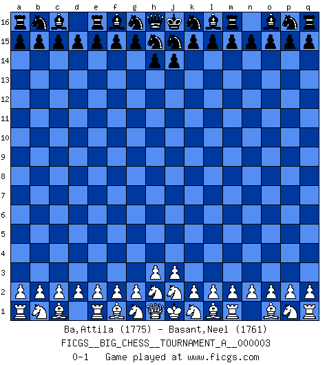 Last move : 0-1 2015 April 22 19:58:26 [Event "FICGS__BIG_CHESS__TOURNAMENT_A__000003"] [Site "FICGS"] [Date "2015.03.23"] [Round "1"] [White "Ba,Attila"] [Black "Basant,Neel"] [Result "0-1"] [WhiteElo "1775"] [BlackElo "1761"] 0-1 This big chess game has been lost on time (started : 2015.03.23 15:59:18) Follow this game move after move (download)There is only one thing Fischer does in Chess without pleasure: to lose ! (Boris Spassky) Im Internet Chess Club betrug mein Rating vorübergehend 3350 ELO-Punkte. (Sergej Karjakin) Para mi, el Ajedrez es la vida y cada partida es como una nueva vida. Todo jugador de Ajedrez suele vivir muchas vidas durante su vida. (Eduard Gufeld) Même un GMI sait rarement calculer sur plus de cinq coups une attaque à sacrifices. (Rudolf Spielmann) Fear is the path to the dark side. Fear leads to anger; anger leads to hate; hate leads to suffering. I sense much fear in you. (Master Yoda in Star Wars ep.1)